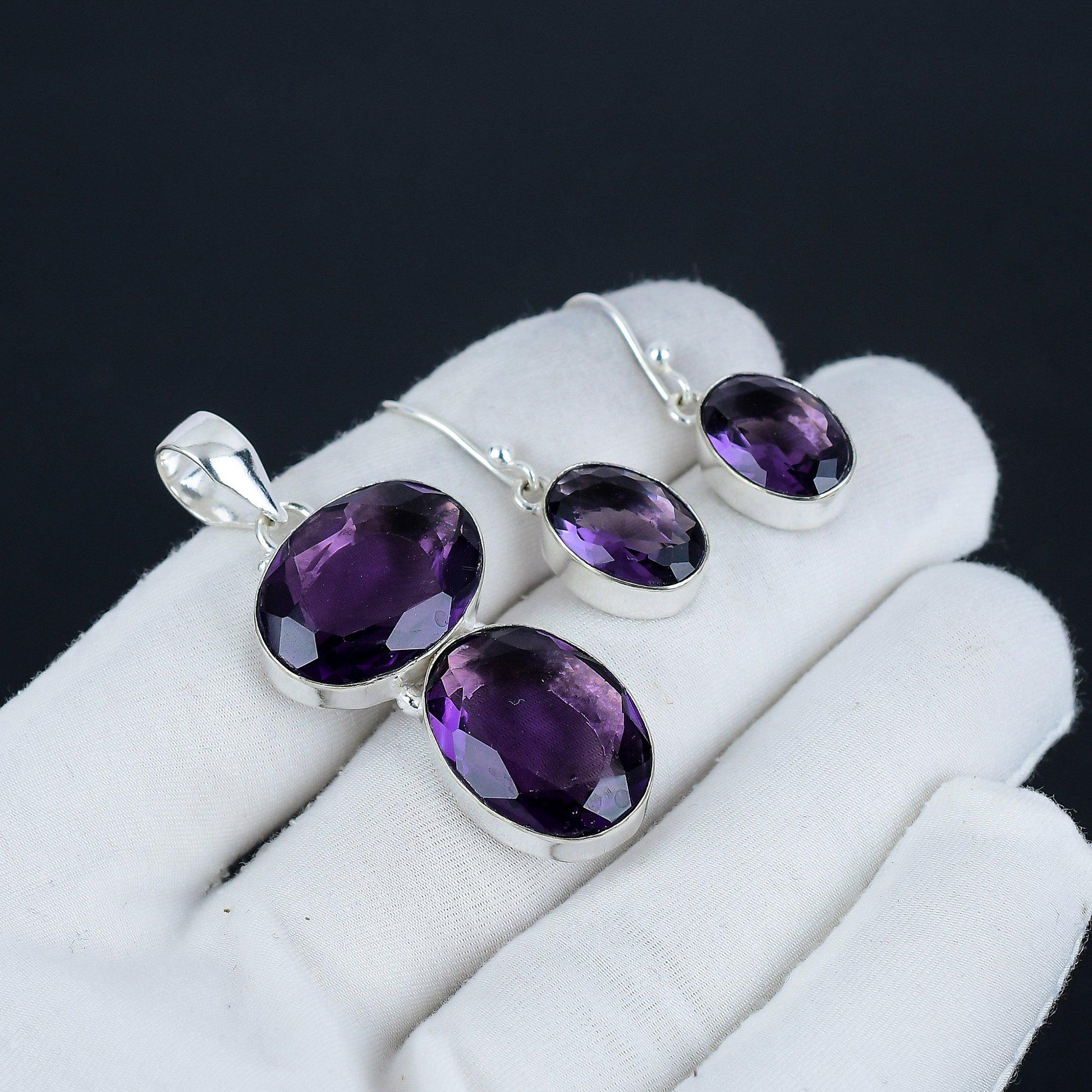 Earrings: Complementing the pendant are the elegant drop earrings, each with a radiant amethyst stone that catches the light beautifully. The simple hook design ensures a comfortable fit, making them perfect for any occasion.