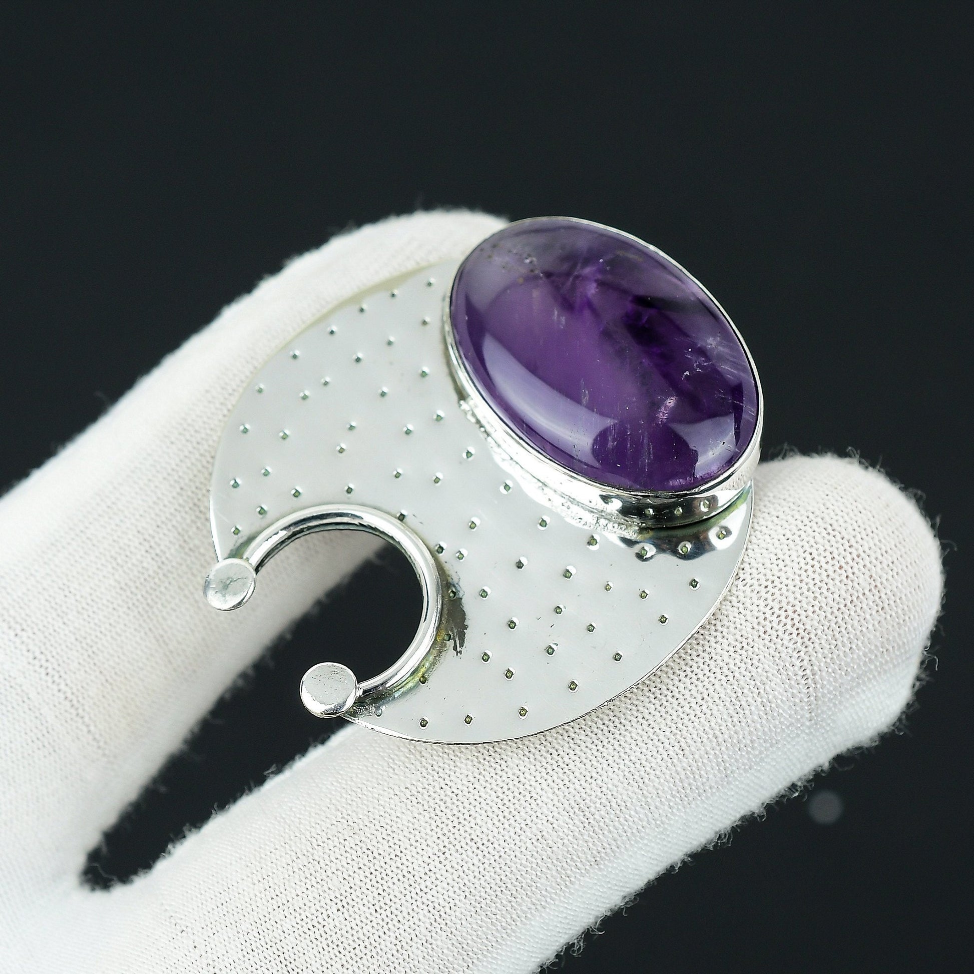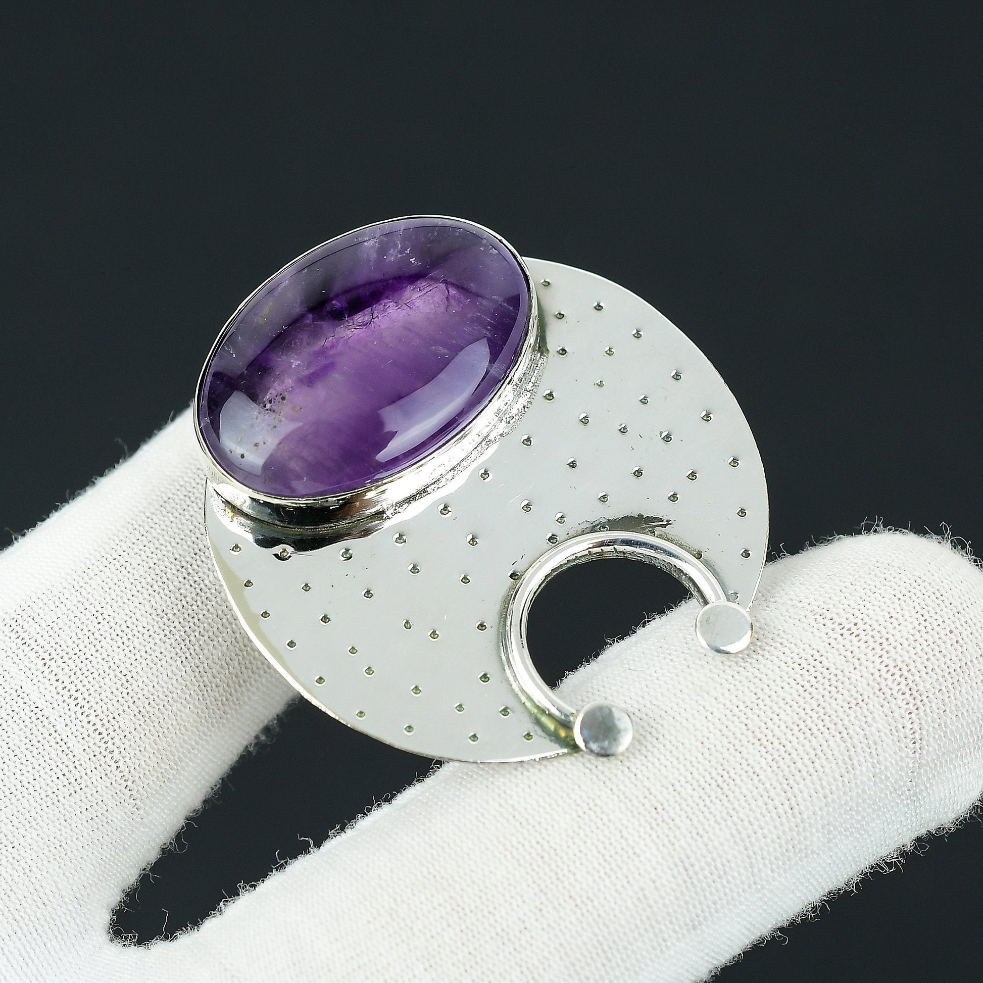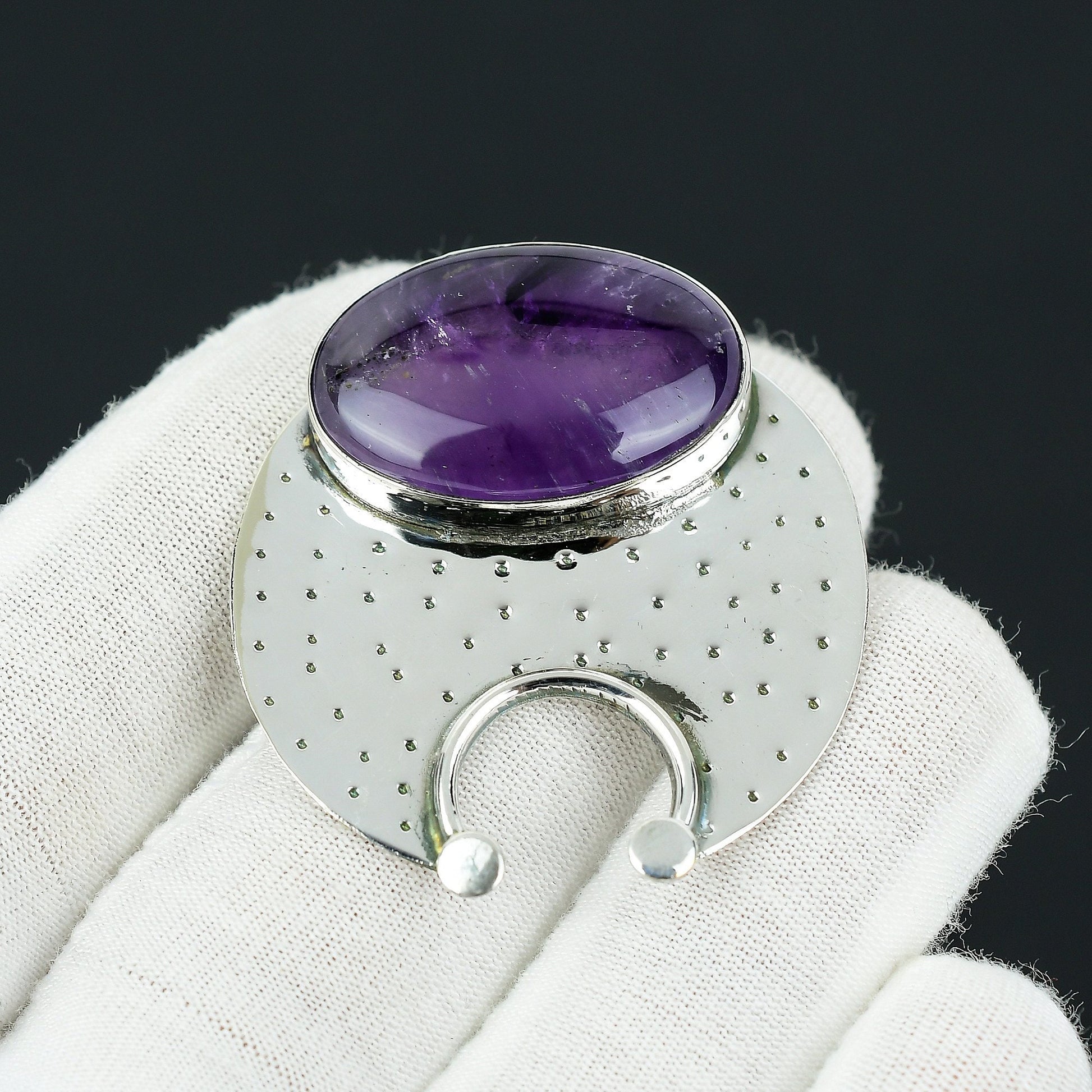 Featuring a rich, oval-cut amethyst set in a polished sterling silver backing, this piece effortlessly combines elegance and modern design. The circular pattern adds a touch of sophistication, perfect for any occasion.