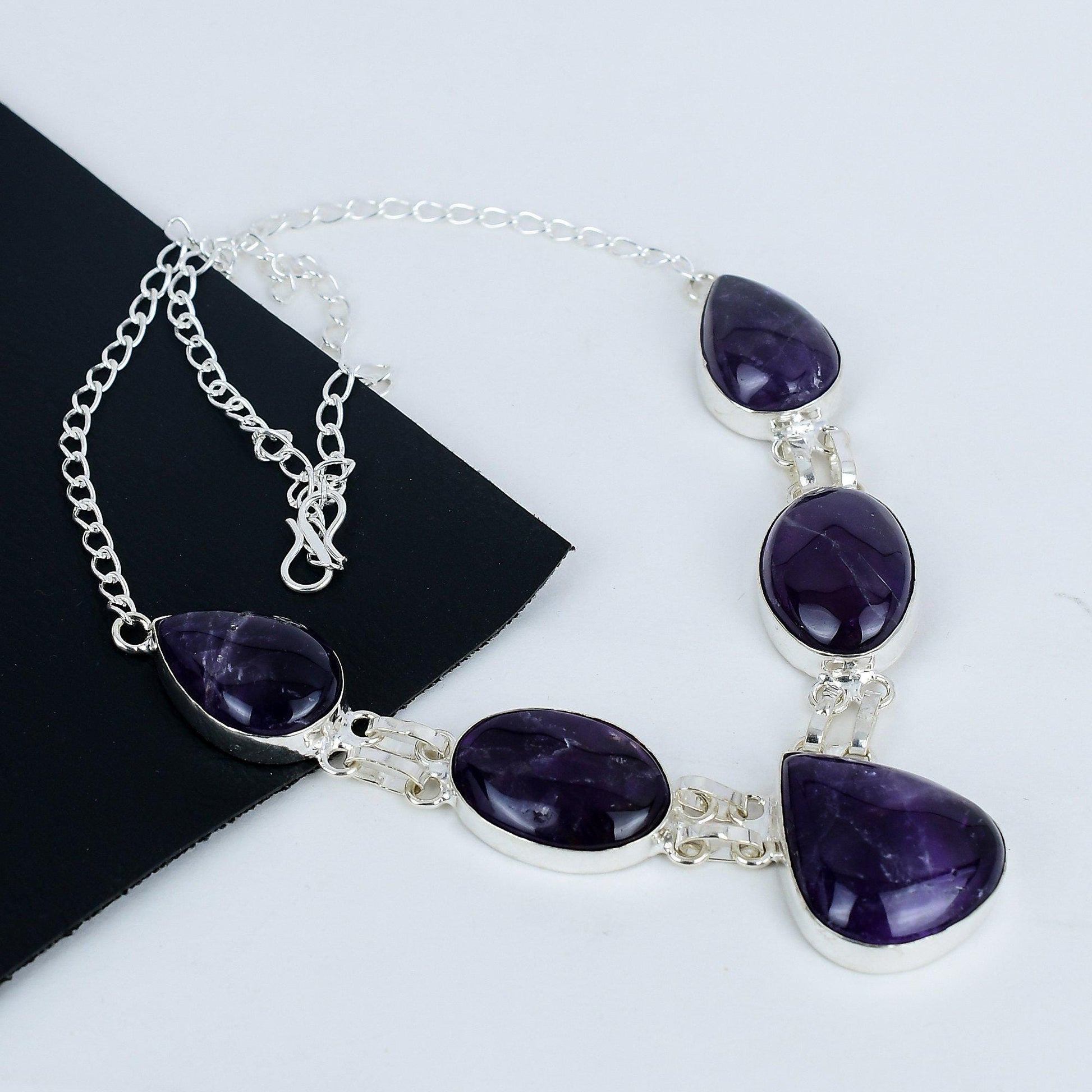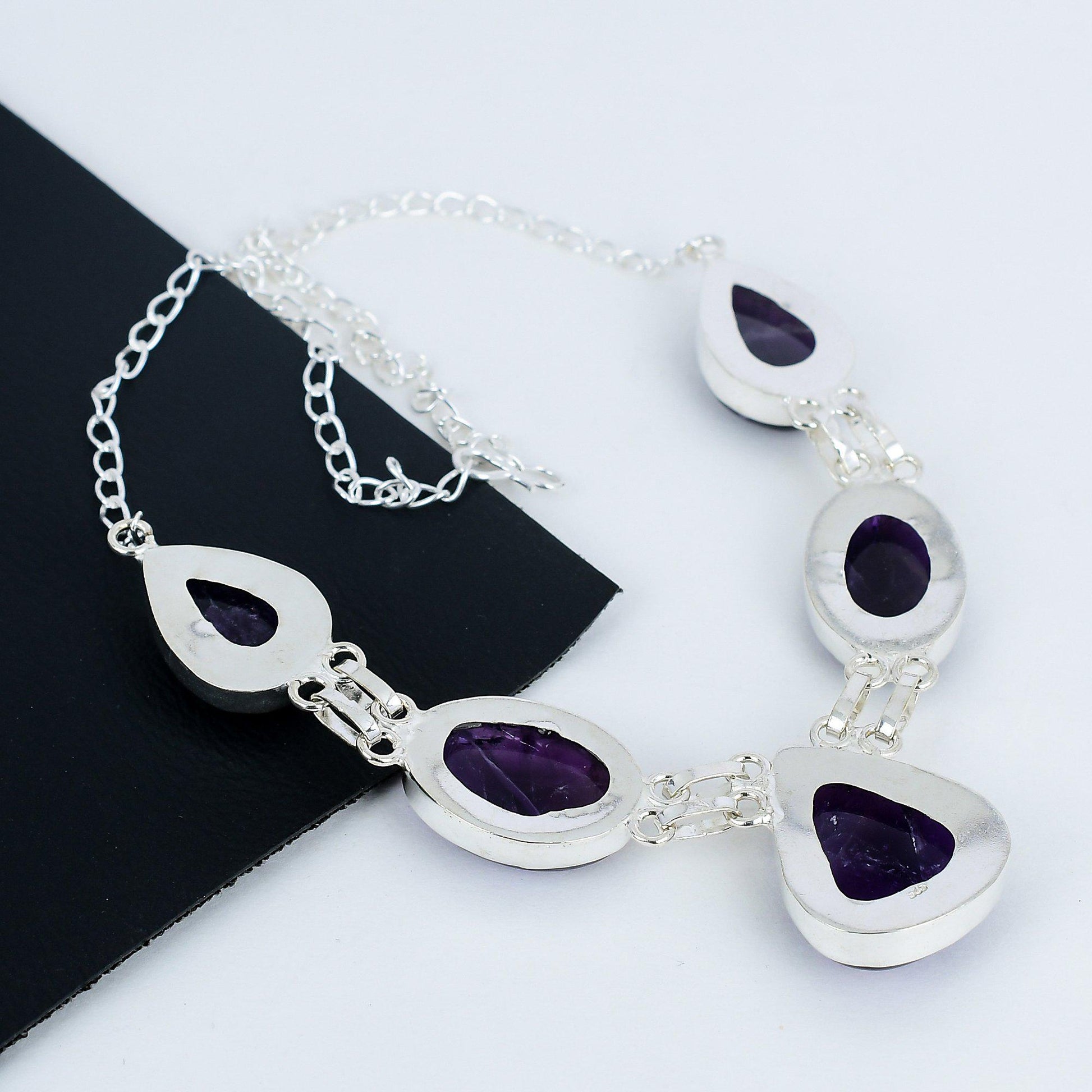 Design: This stunning necklace features a series of rich amethyst stones, each delicately set in polished silver. The teardrop and oval shapes create a harmonious flow, adding a touch of elegance to any outfit.