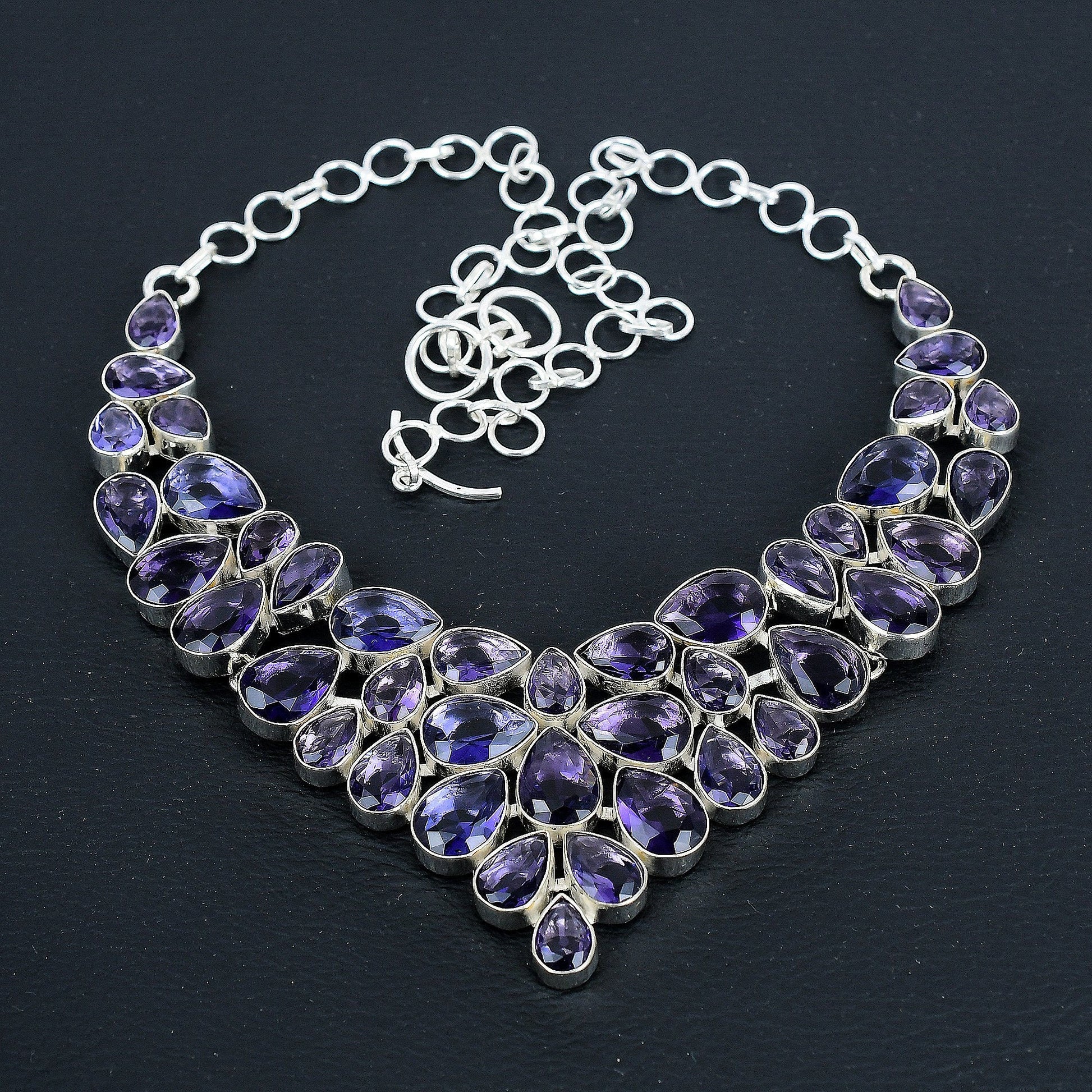 This captivating piece features an array of deep purple amethyst stones, each meticulously cut and set in a harmonious design to catch every eye. The varying sizes of the teardrop and oval gems create a cascading effect that complements any neckline.