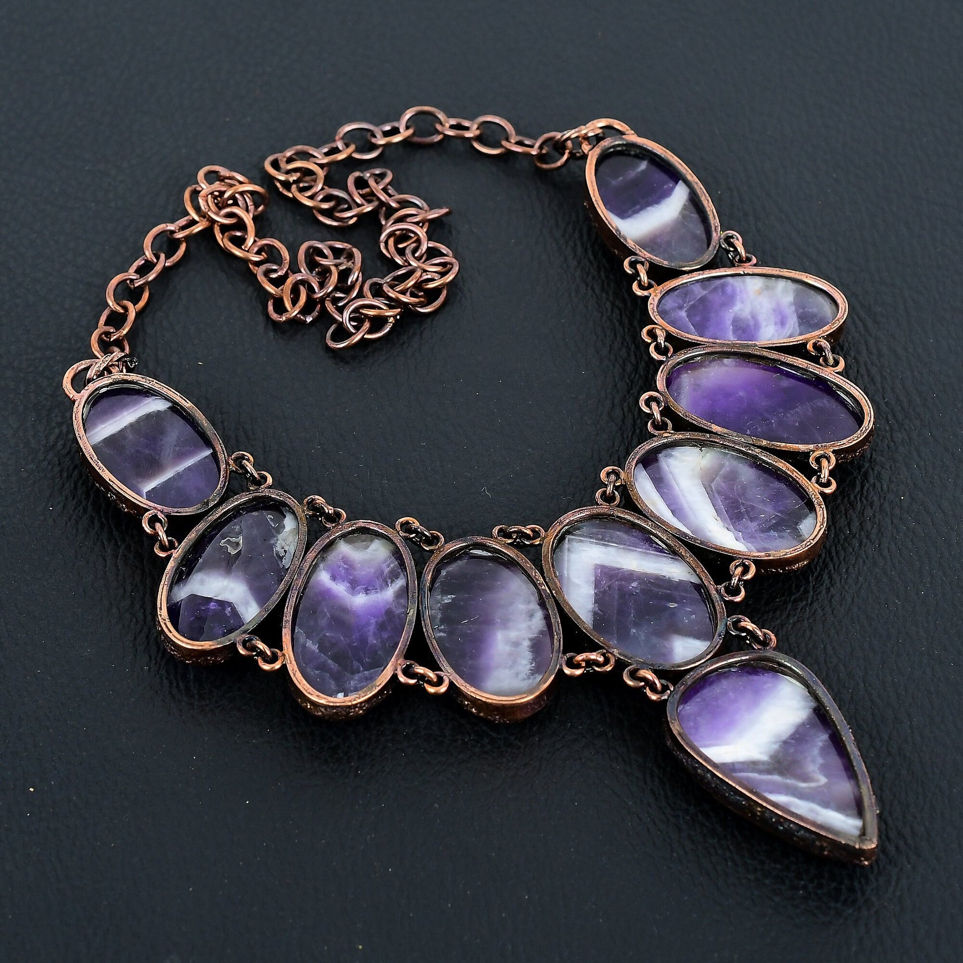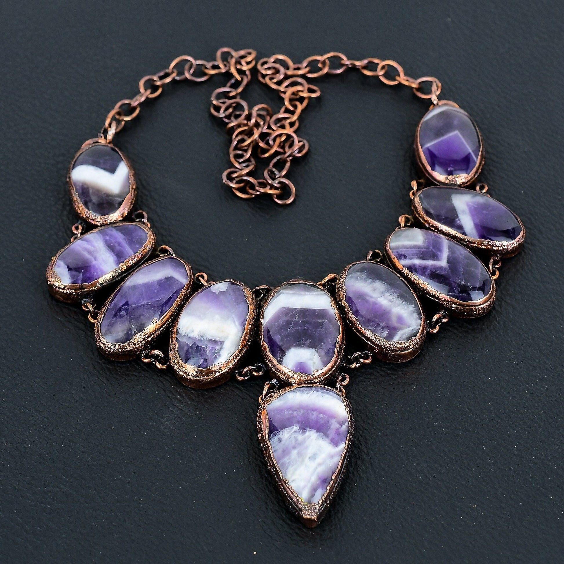 This stunning necklace is designed to enhance any outfit, making it perfect for both elegant evenings and everyday sophistication. The unique charm of the amethyst stones paired with the rustic allure of antique copper offers a timeless appeal.