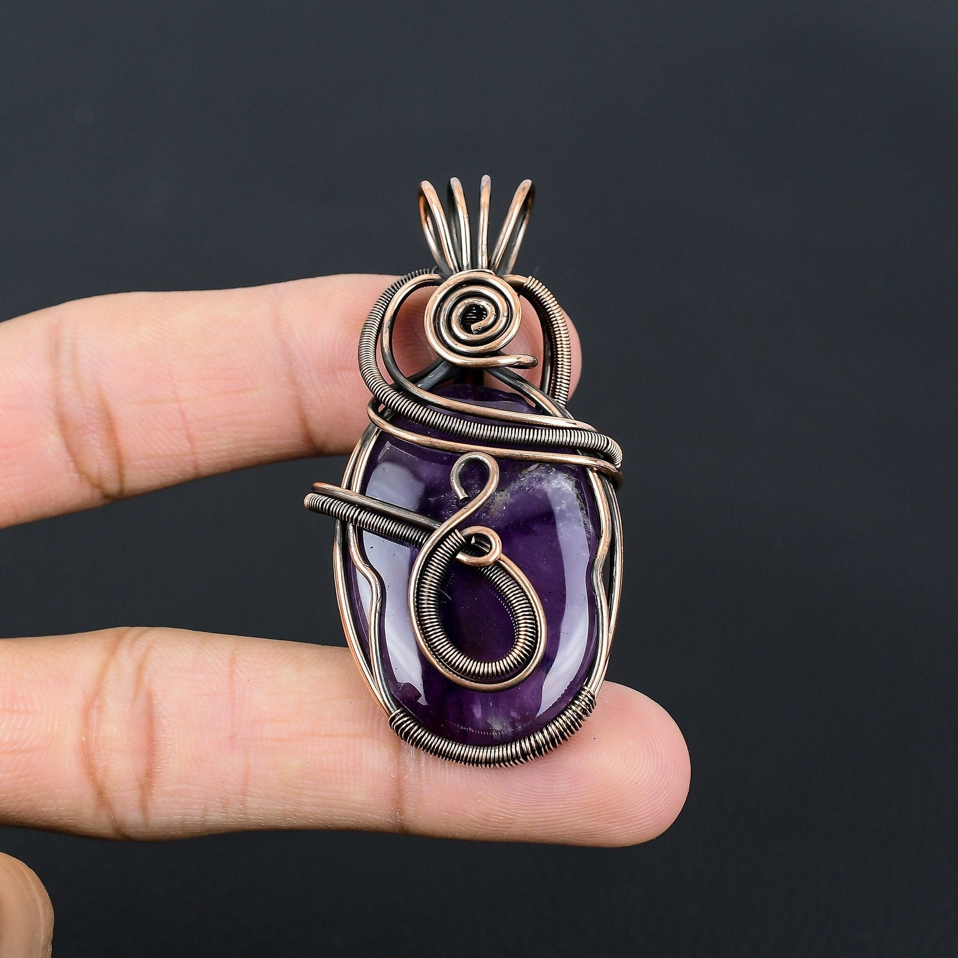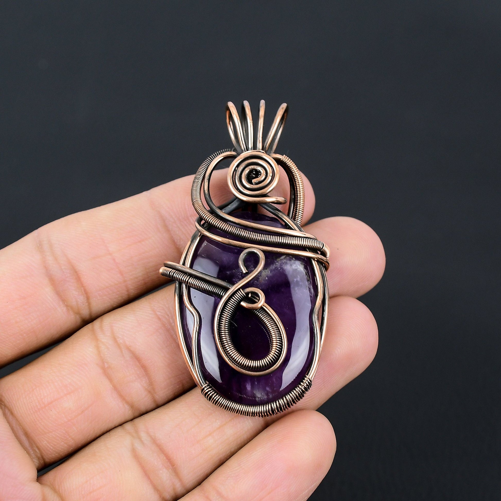 Expertly wrapped in intricate wire work that highlights the natural beauty of the stone, this pendant is a true statement piece. The deep purple hues of the amethyst are complemented by the warm tones of the copper wire, making it a versatile and eye-catching accessory for any wardrobe.
