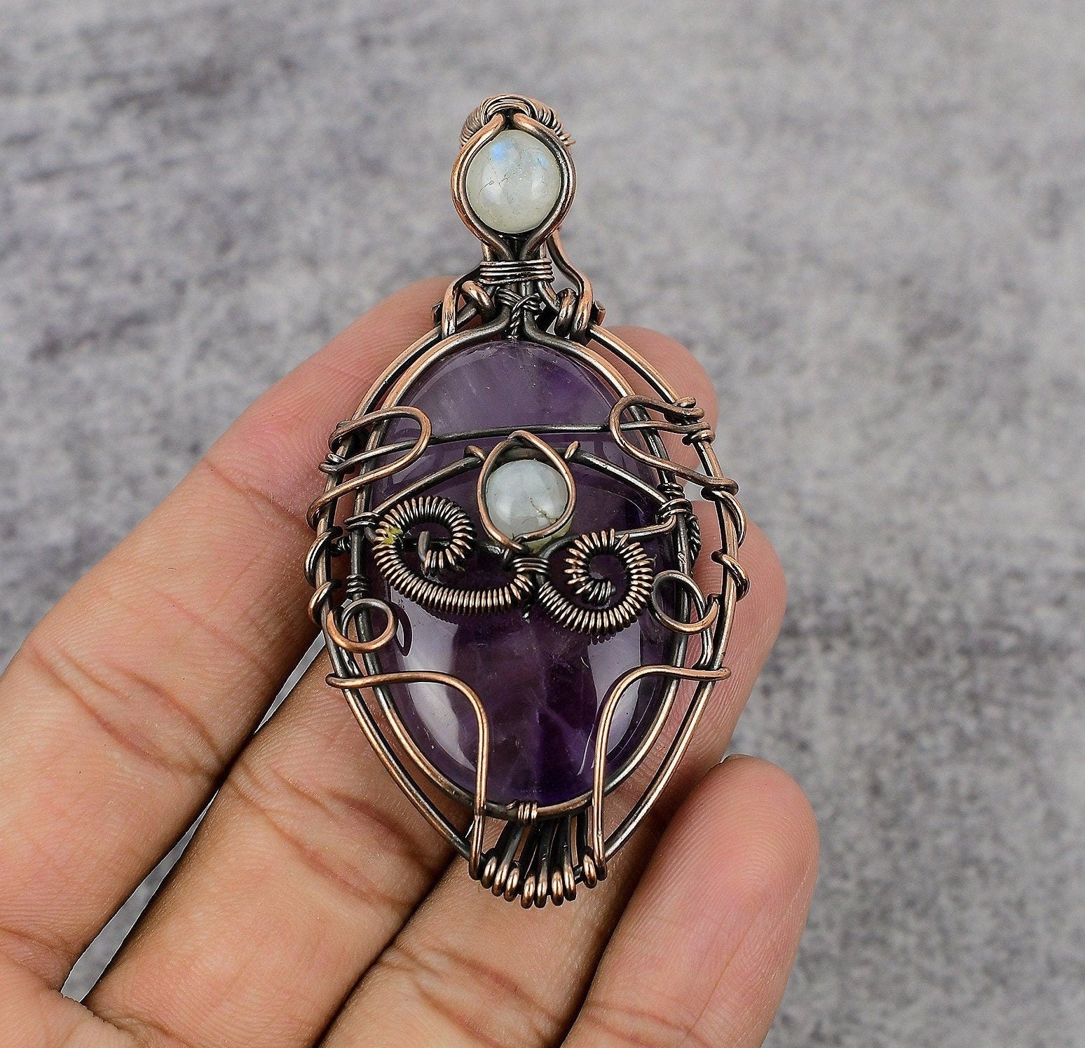 This exquisite piece features a stunning purple amethyst as its centerpiece, enveloped in intricate copper wire detailing. The unique design is further enhanced by a captivating moonstone, adding an ethereal glow.