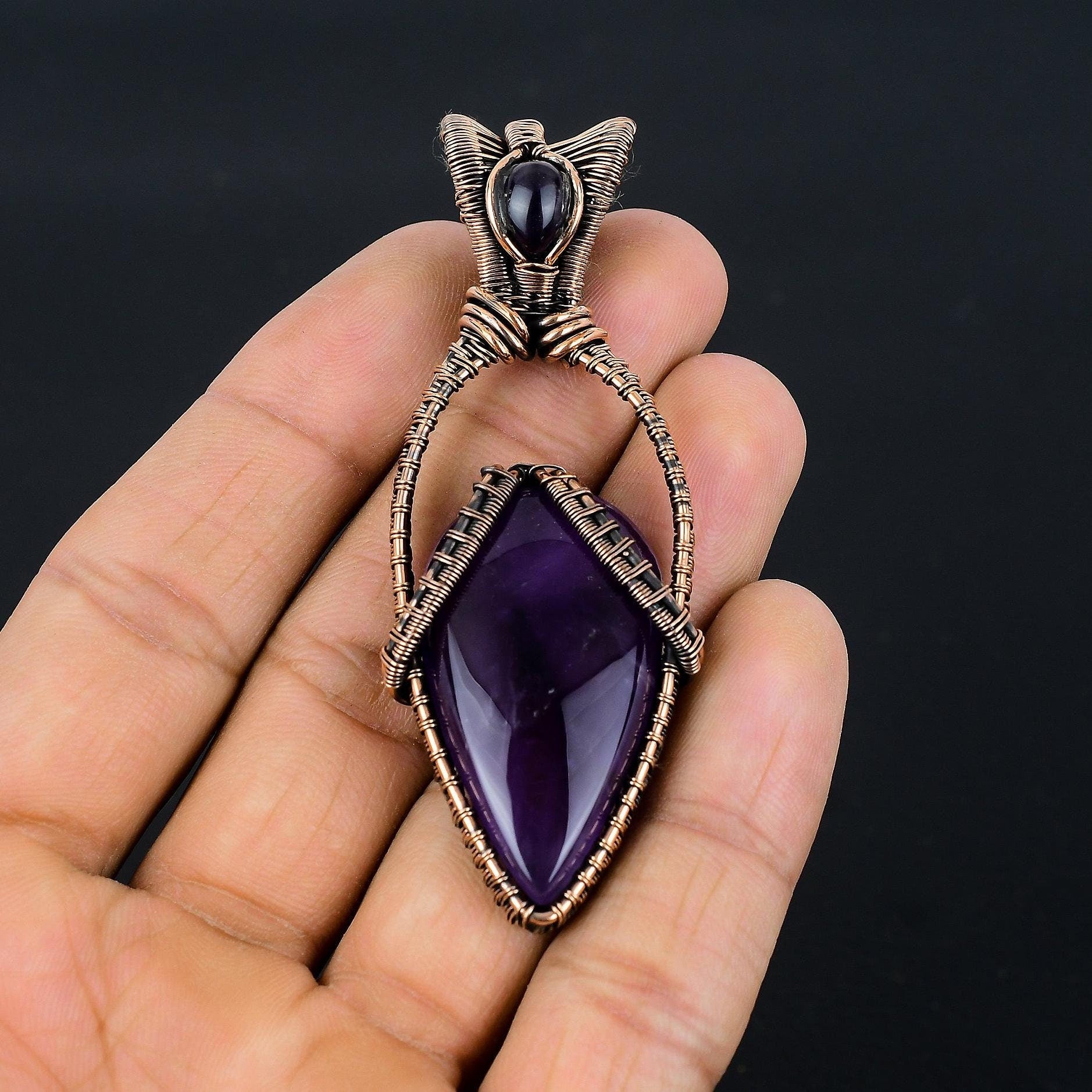 The captivating purple hues of the amethyst are enhanced by the warm tones of the copper, making it a perfect statement piece for any occasion.