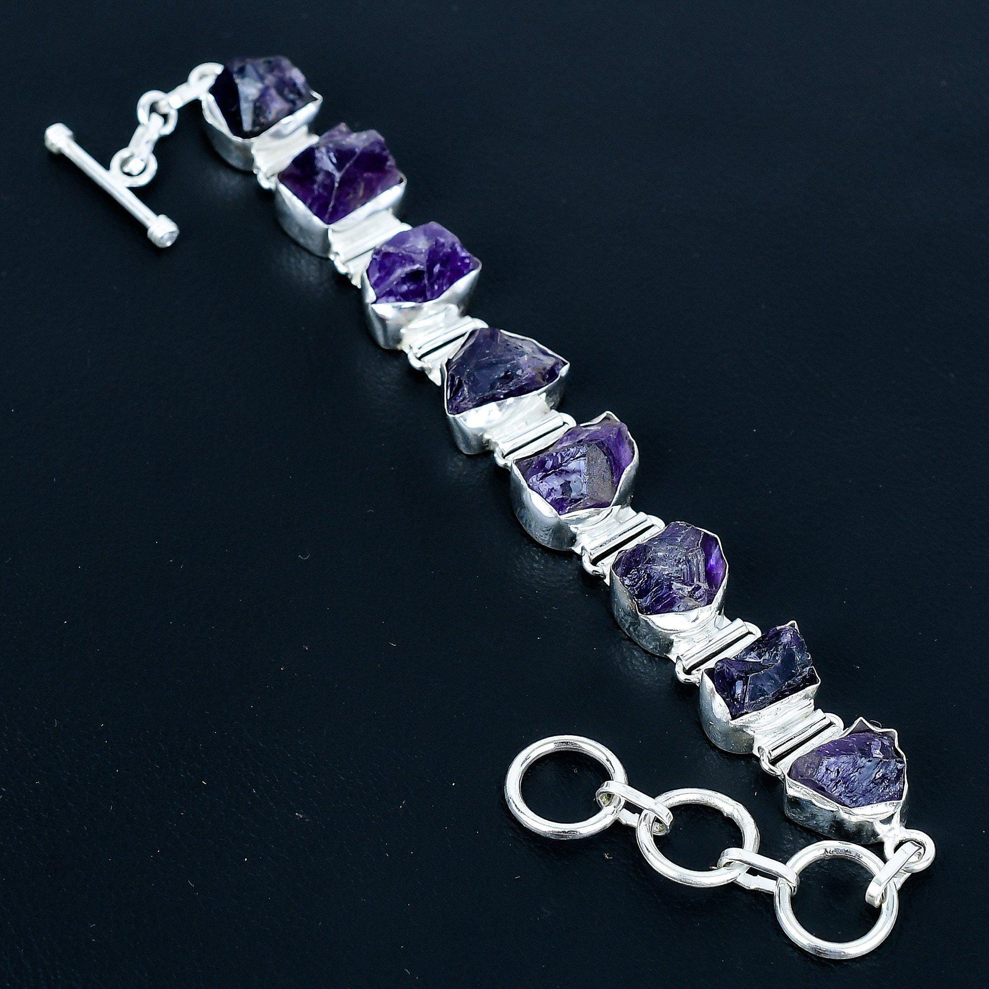 Crafted from genuine amethyst stones, each gem is uniquely shaped and set in shimmering sterling silver. Its deep purple hues add a touch of royalty and sophistication to any outfit.