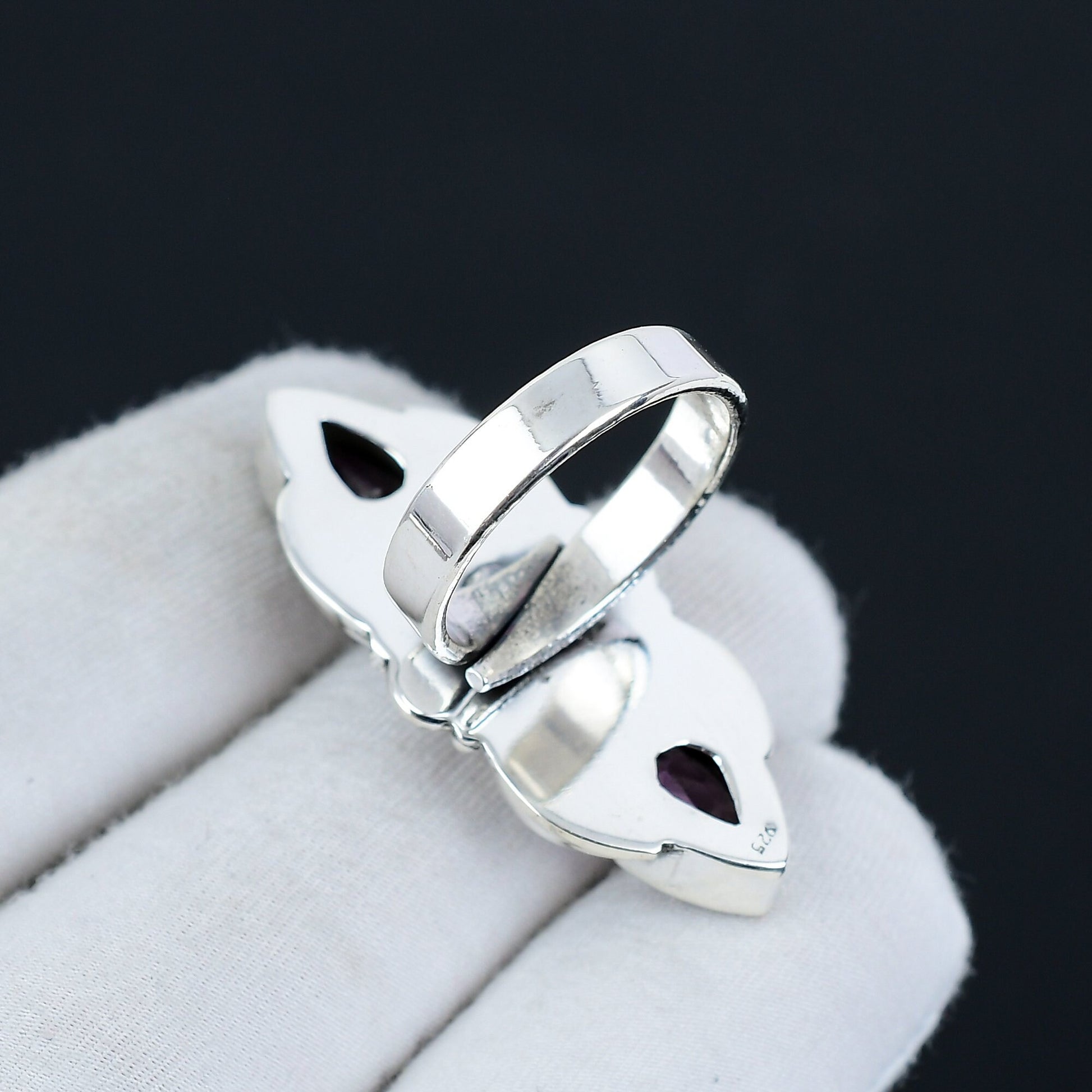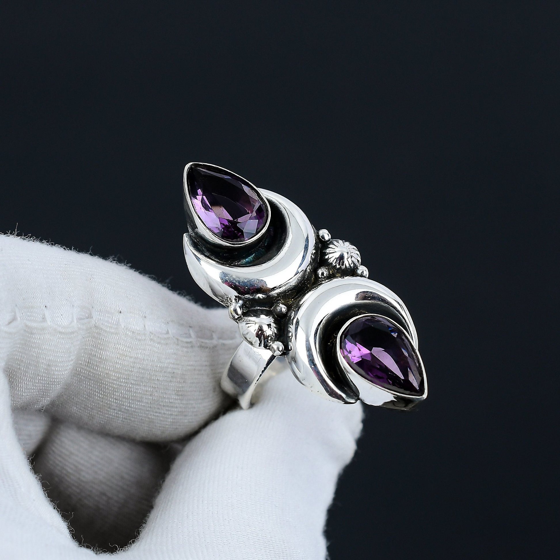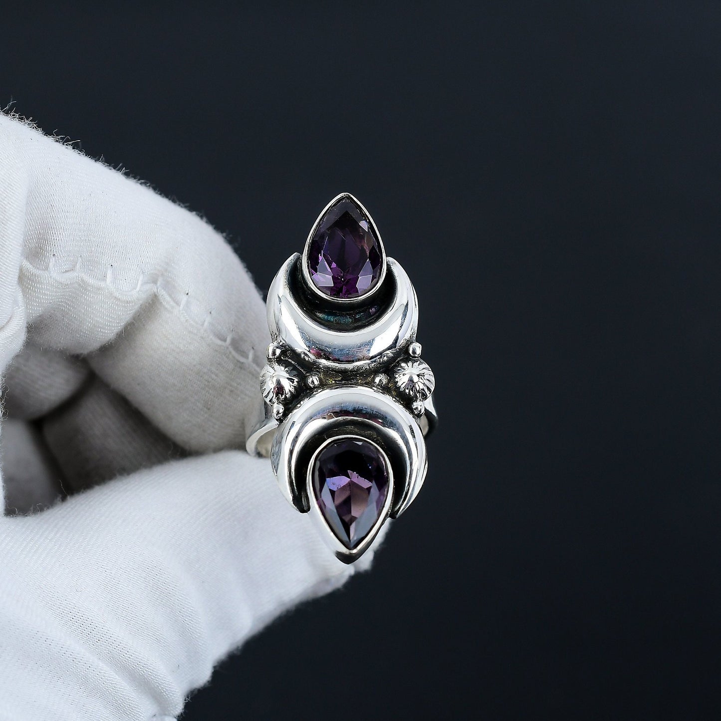 Discover the elegance of our handcrafted sterling silver statement ring, featuring two exquisite amethyst gemstones.