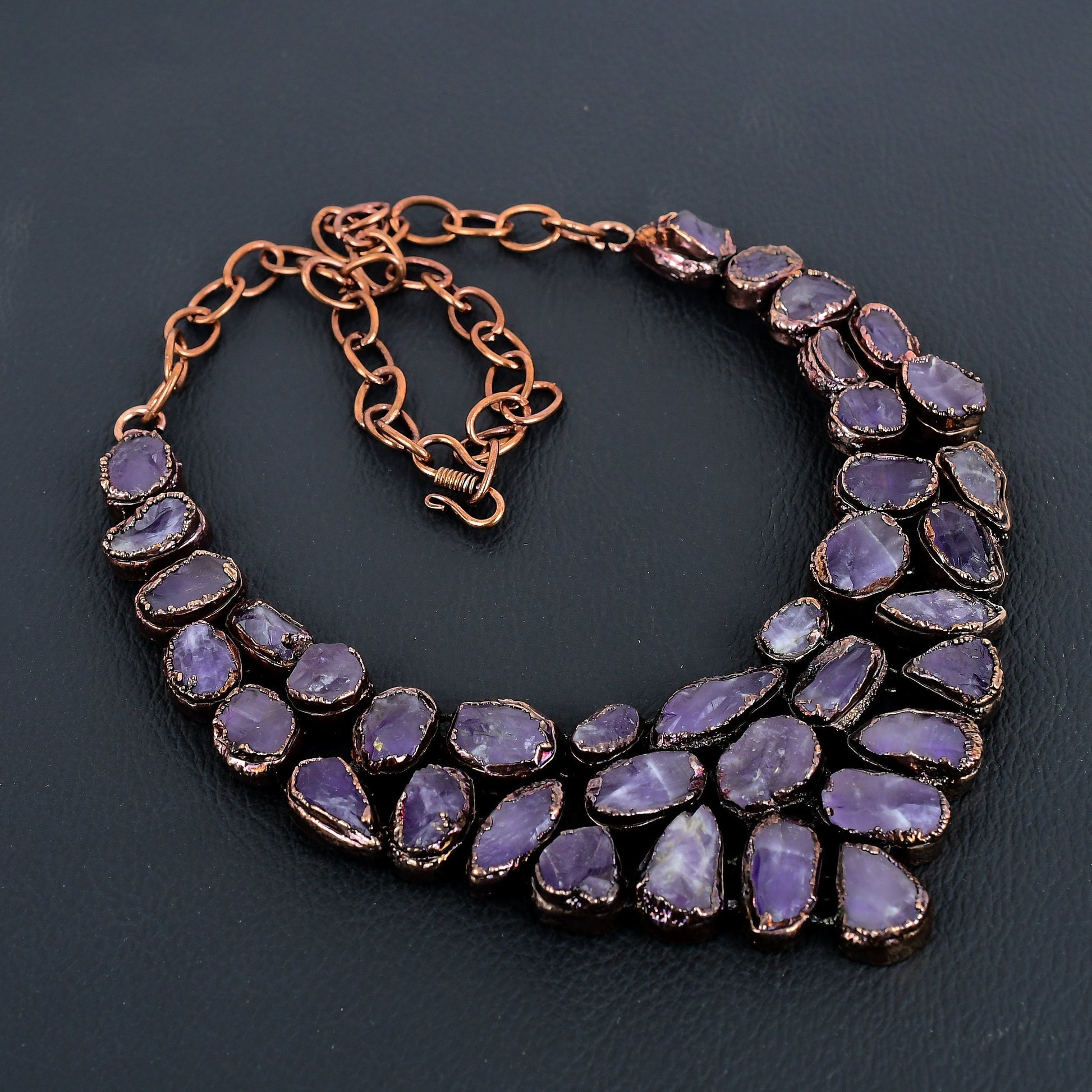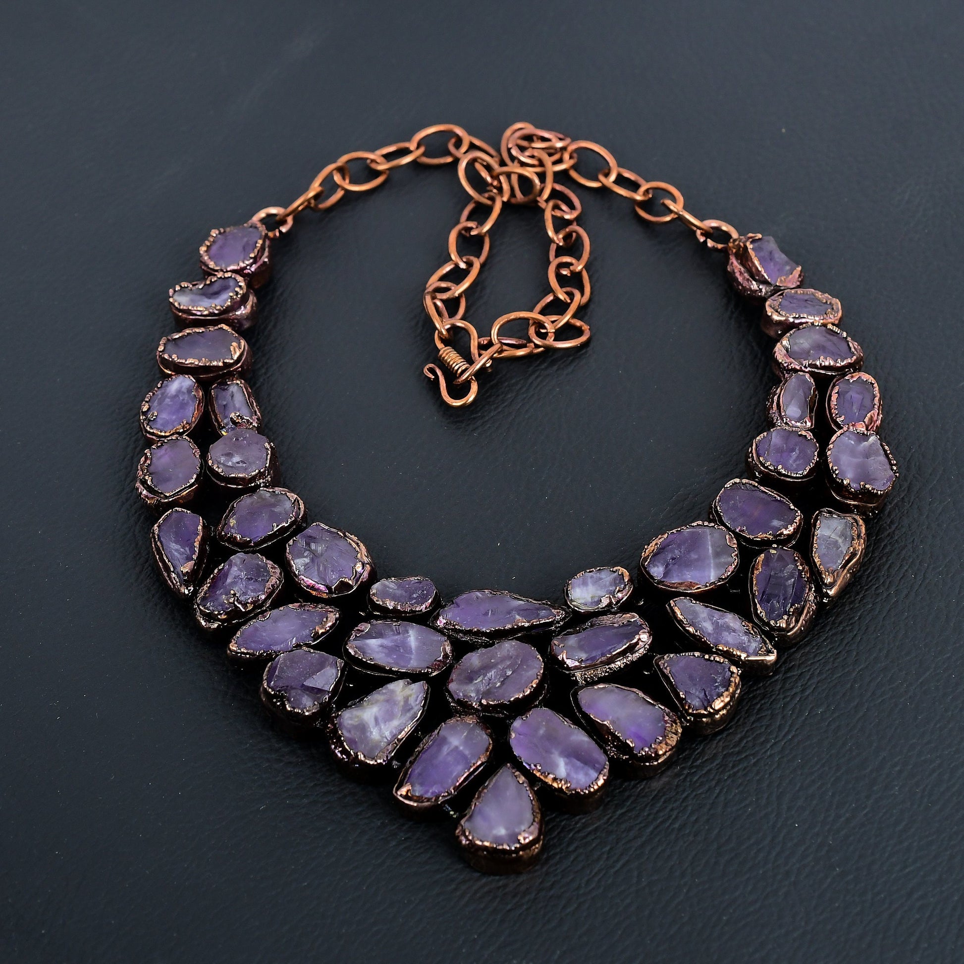 Enhance your elegance with this exquisite handcrafted necklace, beautifully showcasing an array of stunning amethyst stones set in a unique copper finish.