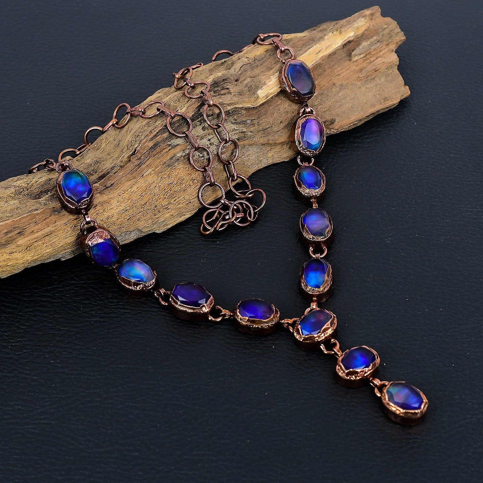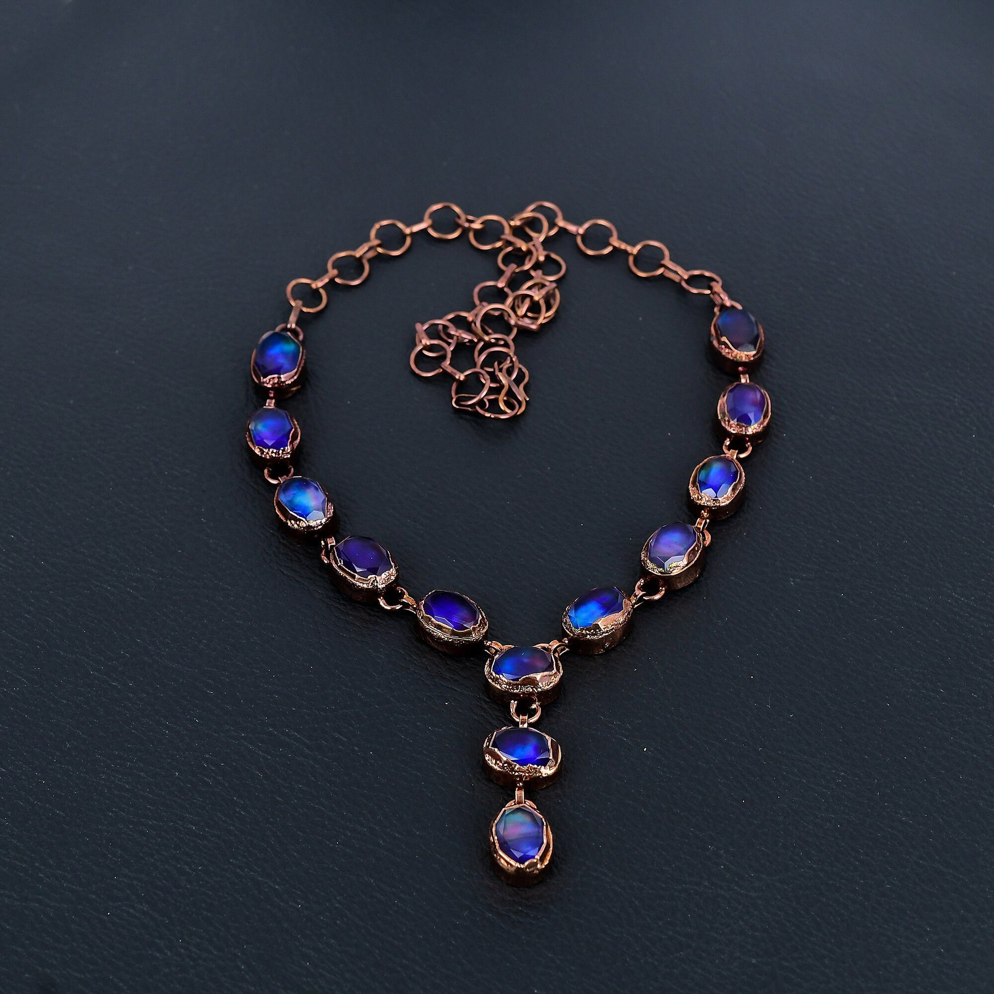 This stunning piece features a harmonious blend of deep blue stones, each delicately set in antique copper links, creating a timeless yet modern look.
