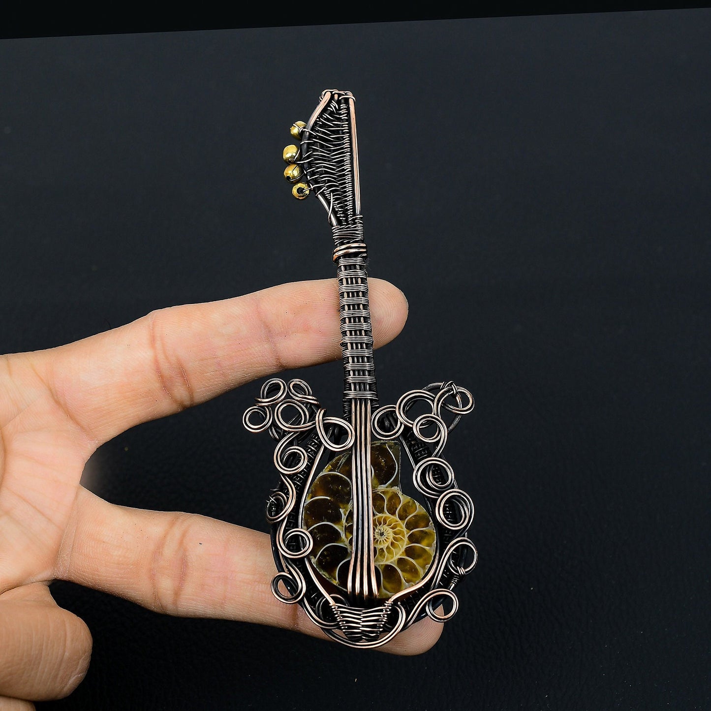 Crafted with intricate detailing, this pendant showcases a unique ammonite fossil at its center, enveloped in elegant copper wire that mimics the strings of a mandolin.