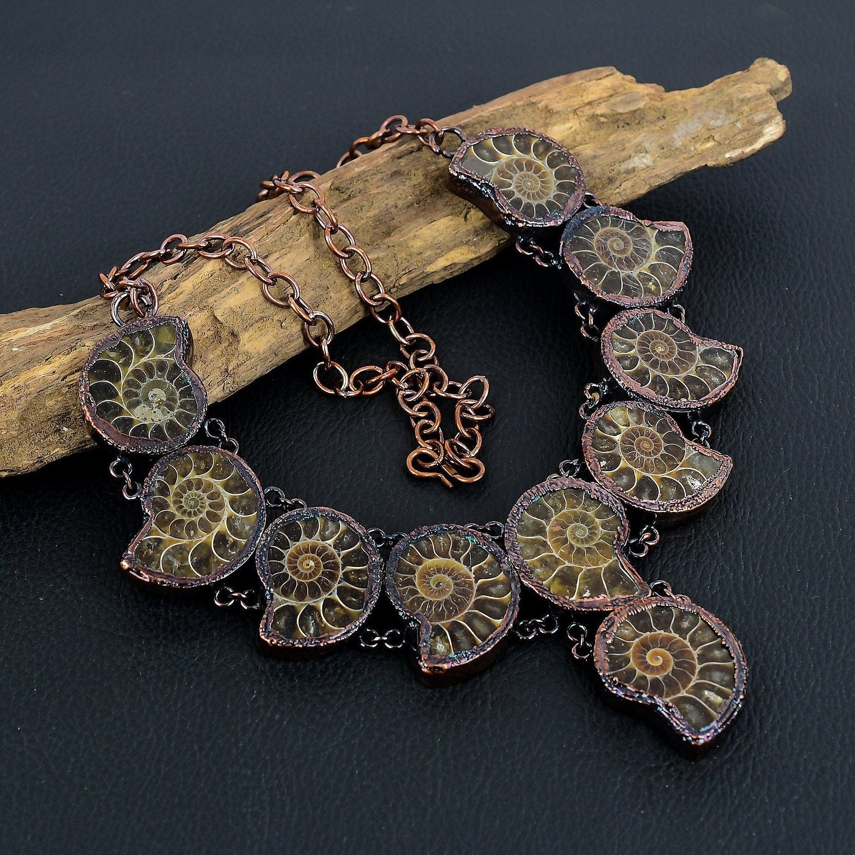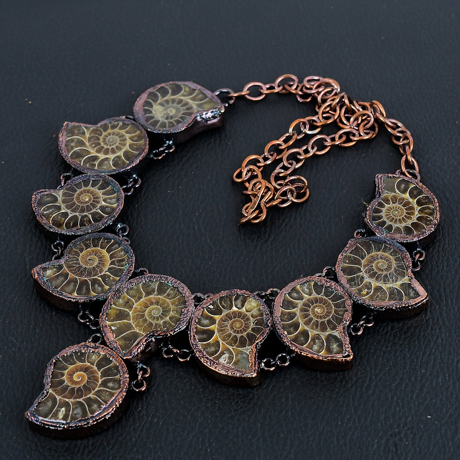 - Material: Fossilized Ammonite, Copper