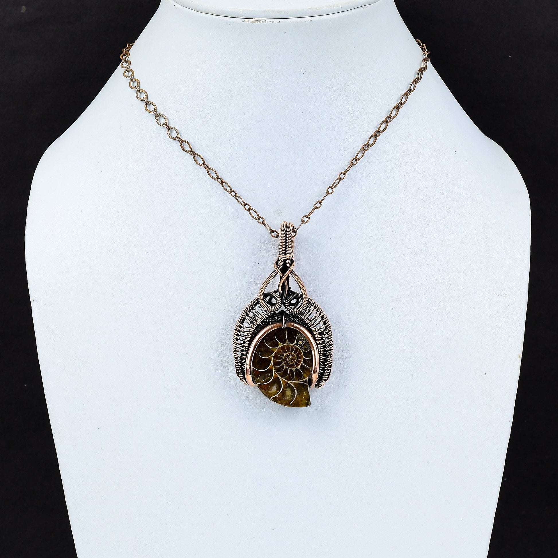 Introducing our exquisite handcrafted Ammonite Fossil Pendant, a perfect blend of natural history and elegance. This unique piece showcases the intricate beauty of a genuine ammonite fossil, skillfully wrapped in high-quality copper wire.