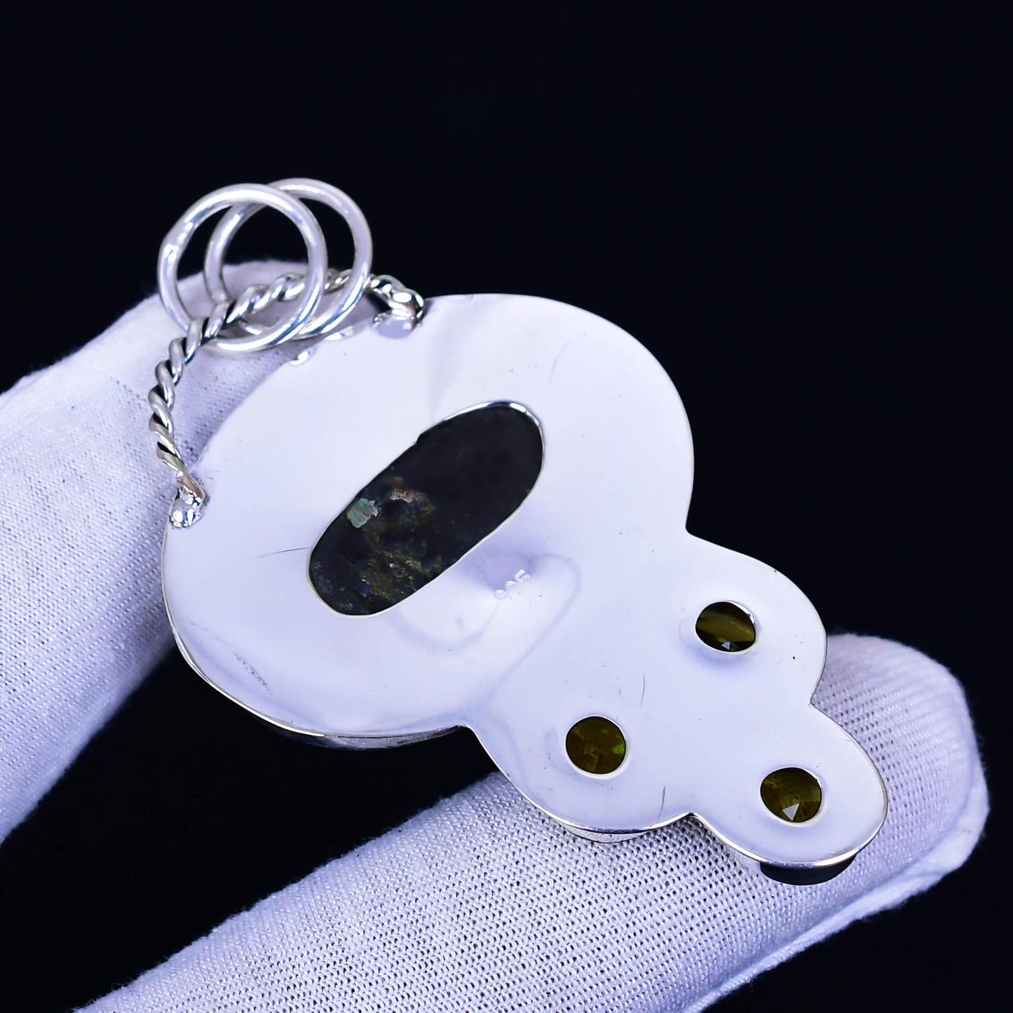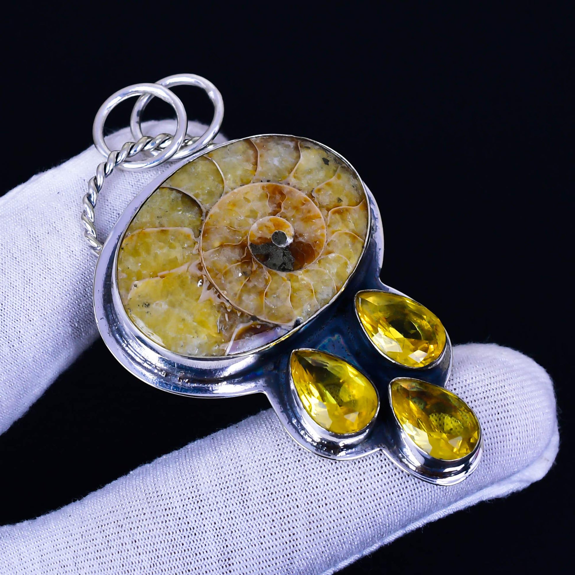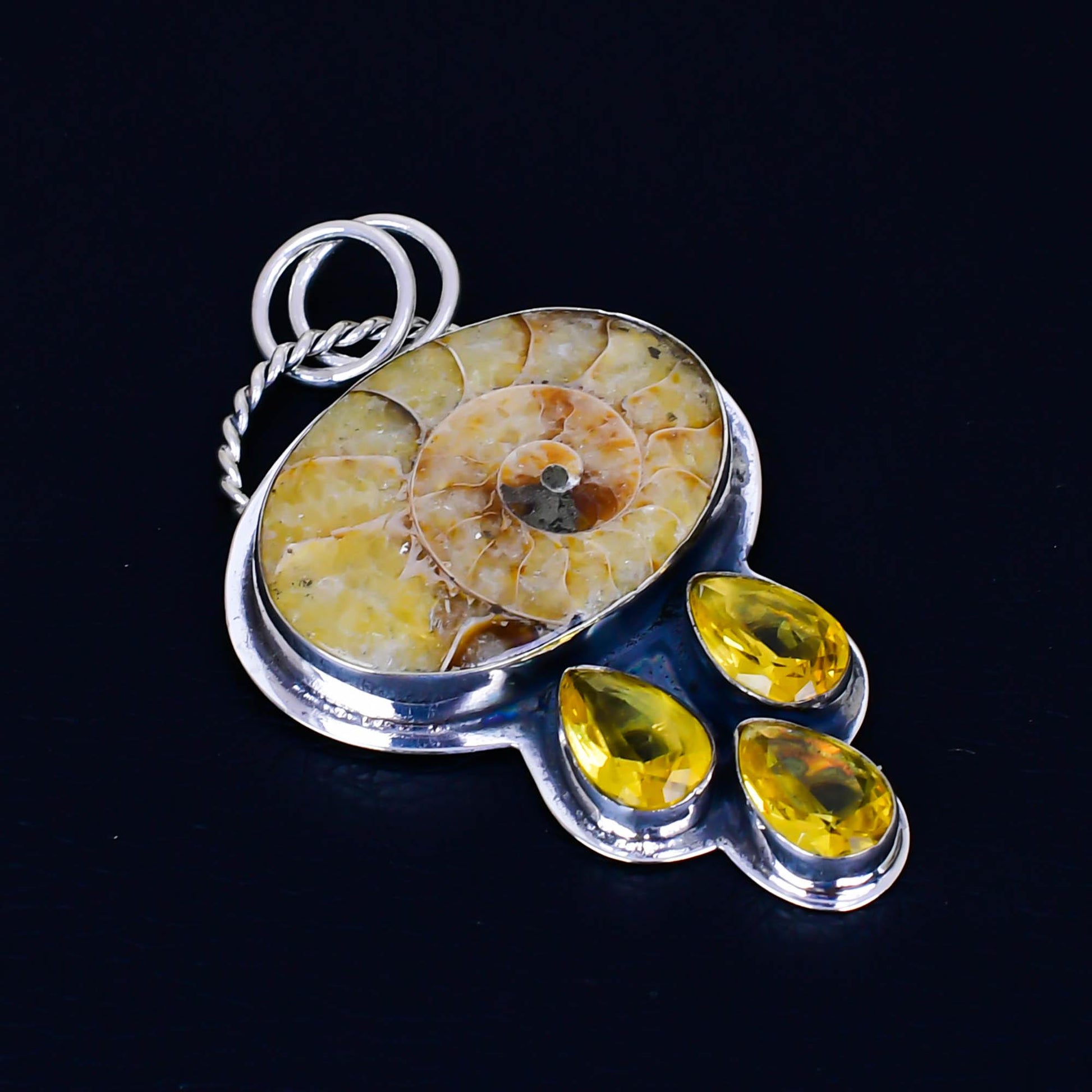 - Elegant Design: Set in durable metal, the fossil is complemented by three teardrop-shaped yellow gemstones, adding a touch of elegance and sparkle.
