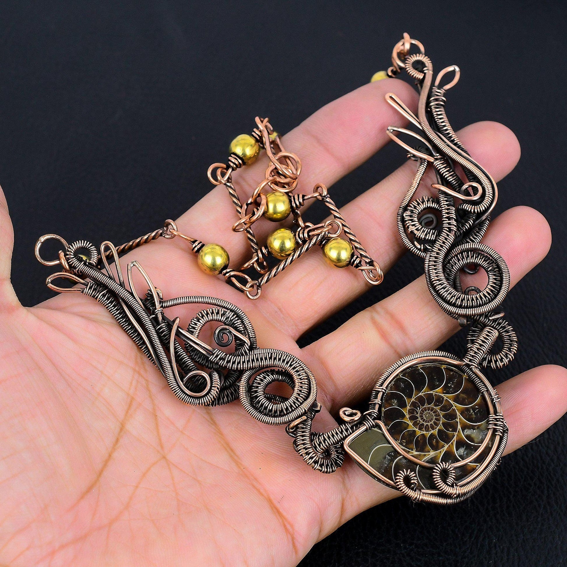 This exquisite piece features a stunning ammonite fossil centerpiece, delicately encased in an intricate wire-wrapped design.