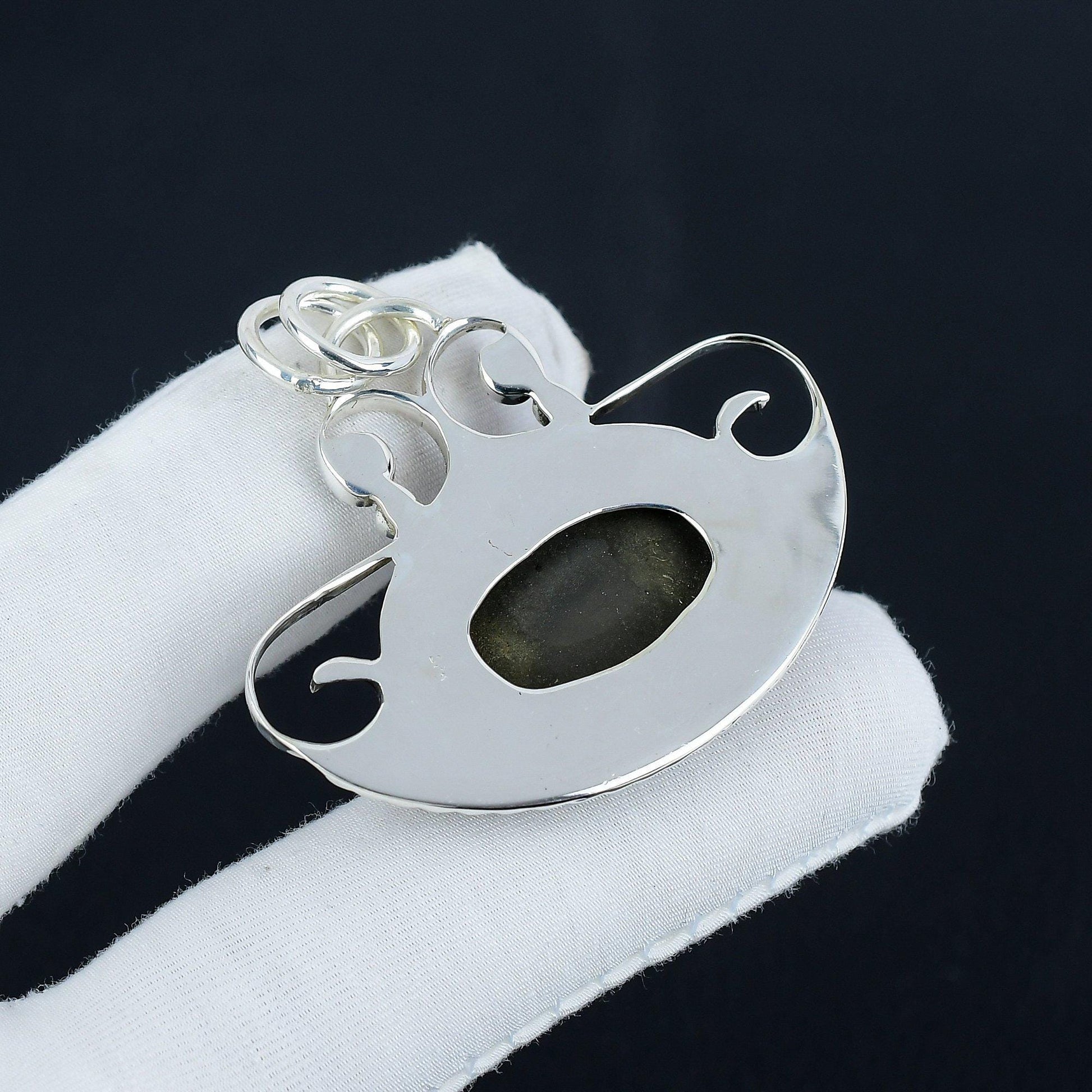 - Unique Design: The pendant features a beautifully polished central stone set within an ornate silver framework.