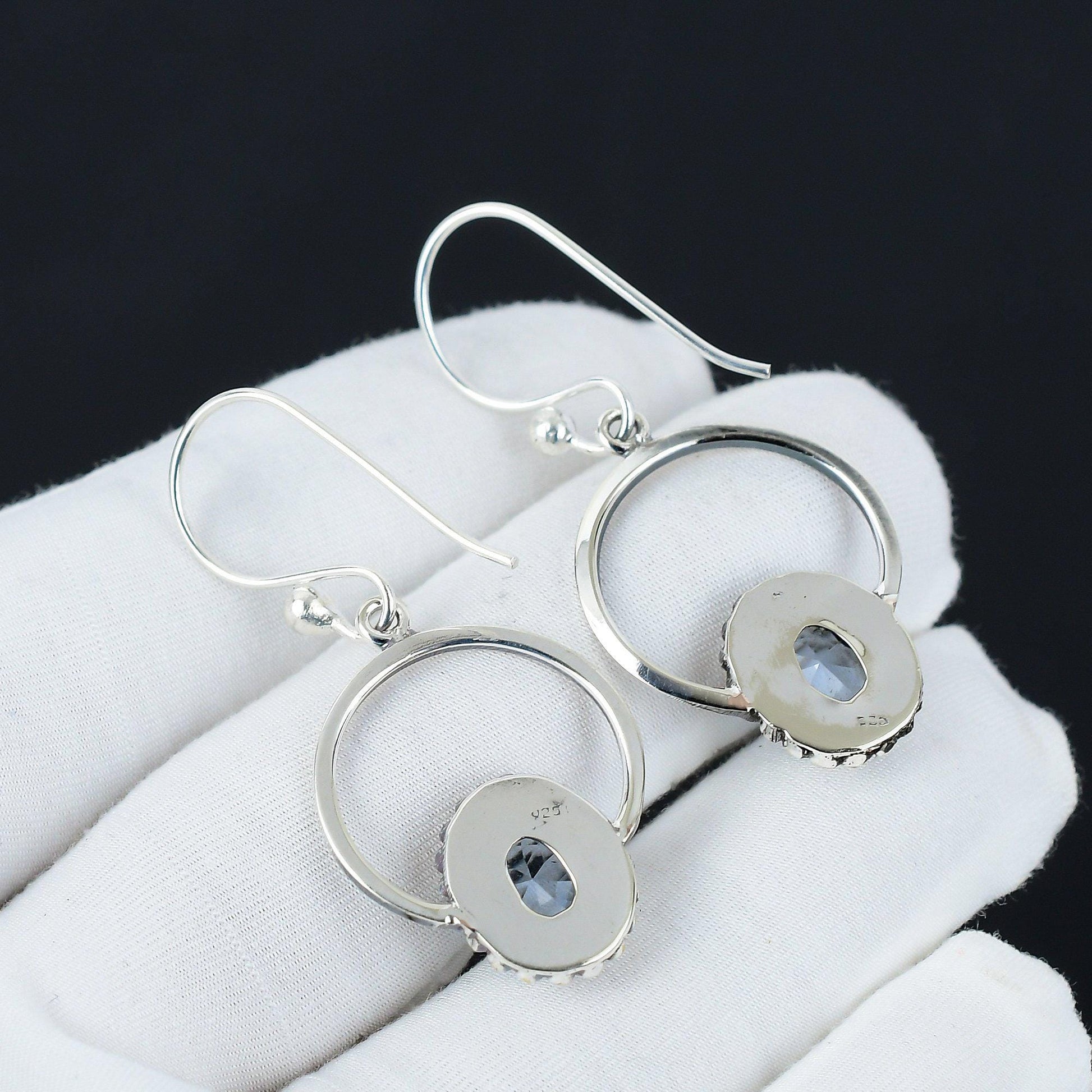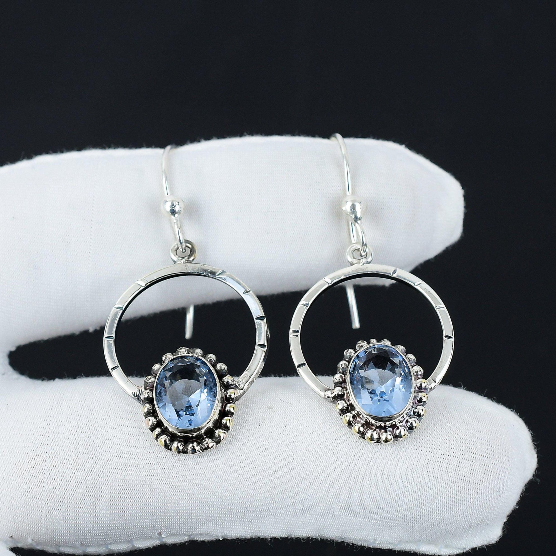 Featuring a beautifully crafted circular design, these earrings boast a mesmerizing blue gemstone at the center, surrounded by intricate silver detailing.