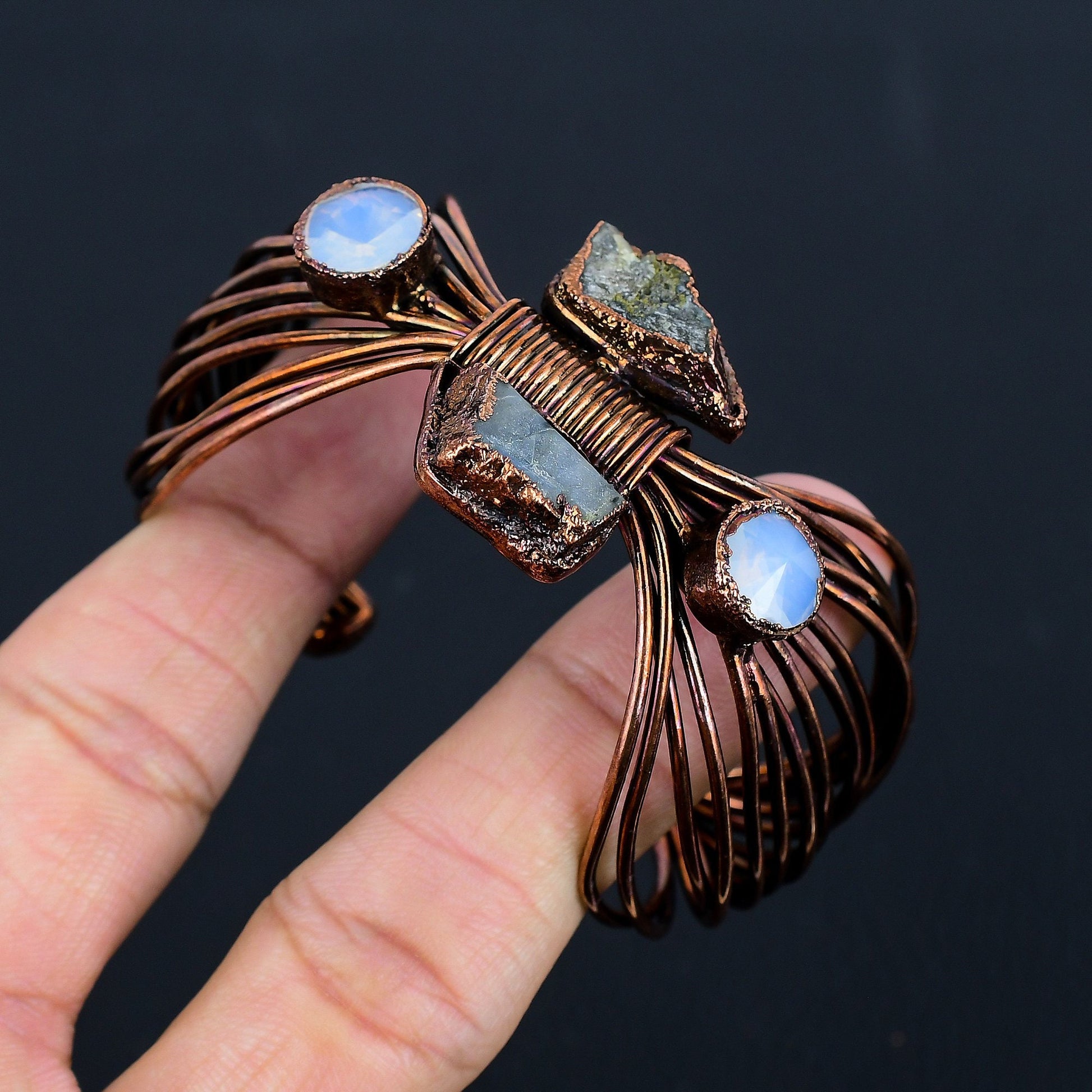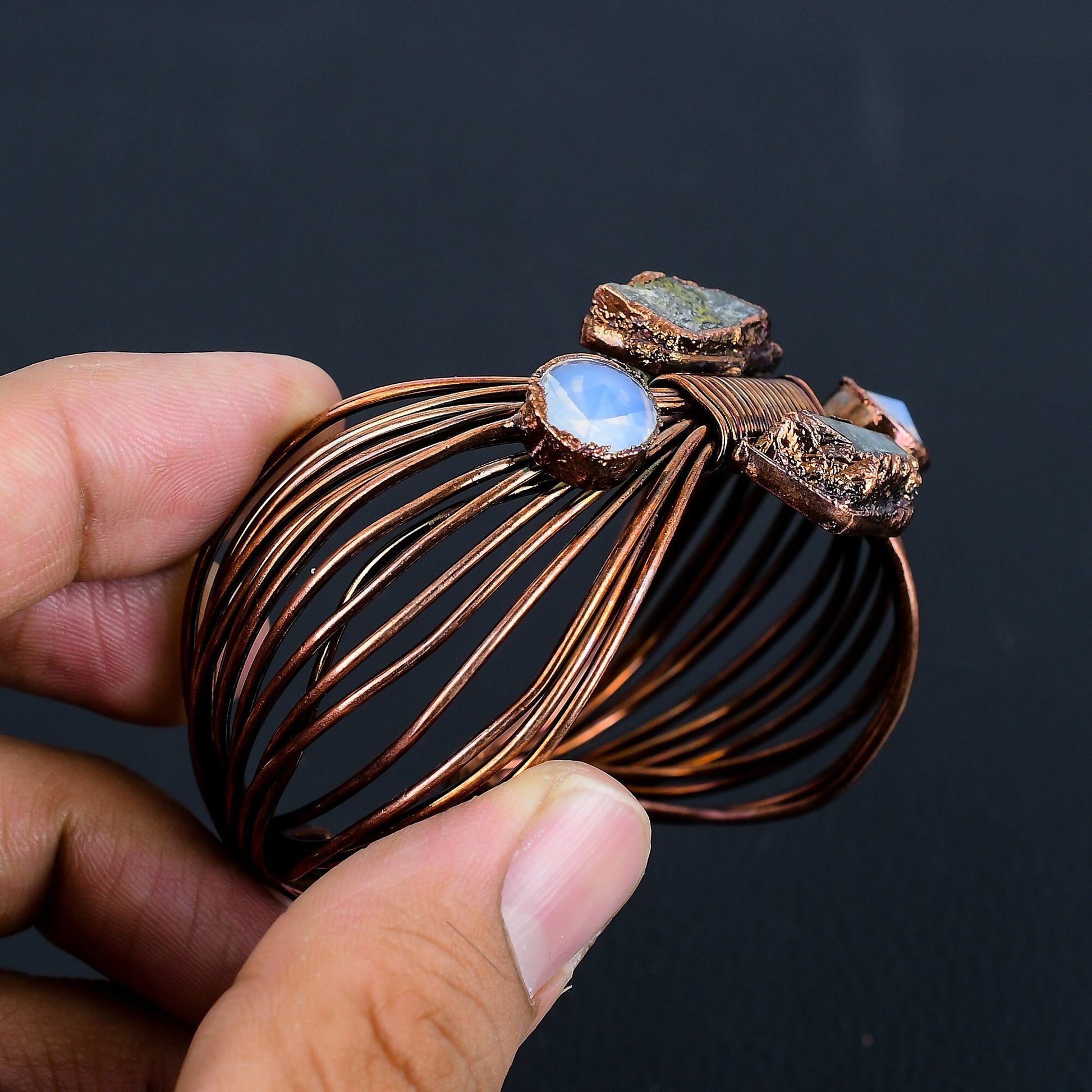 This bracelet showcases the natural beauty of raw gemstones, each chosen for its unique color and character. The combination of the earthy copper tones with the vibrant stones makes this piece a versatile addition to any jewelry collection.