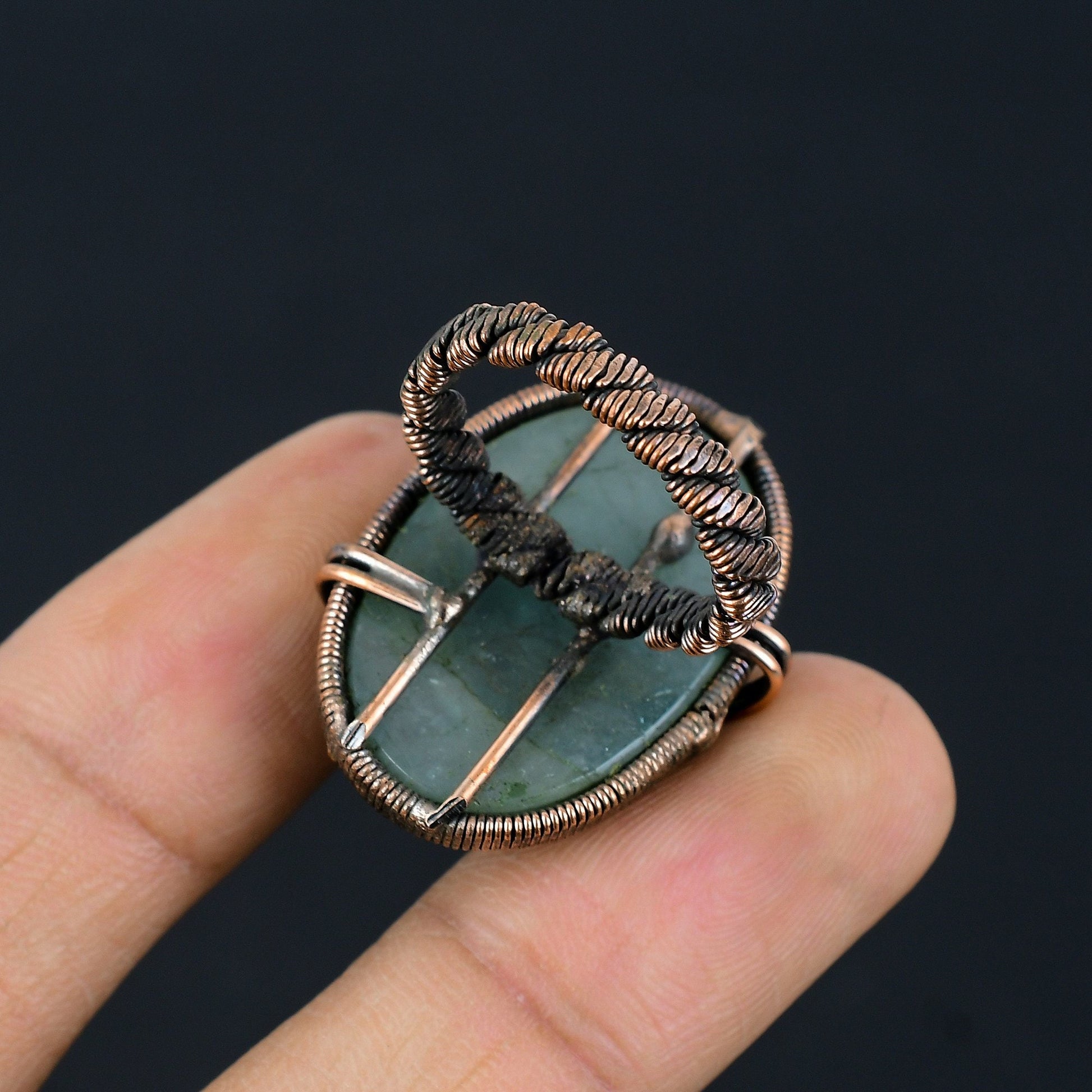 Design: This exquisite piece features a captivating aquamarine centerpiece, delicately encased in a rustic copper wire wrap. The intricate swirl detail enhances the stone's natural beauty, providing an artisanal touch.