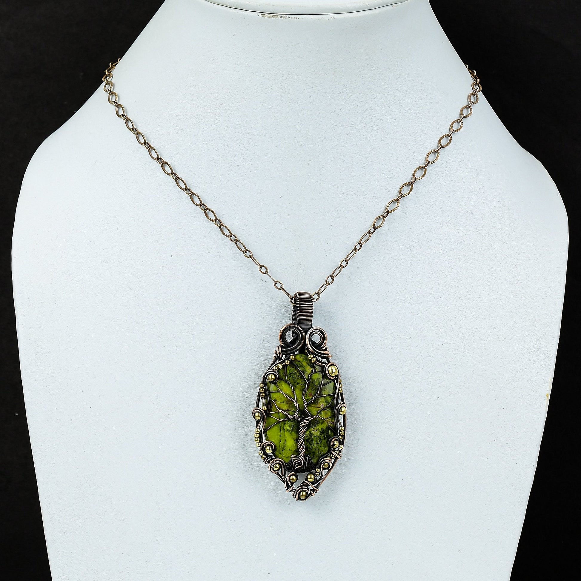 This stunning piece features intricate copper wirework, encircling a radiant green stone, reminiscent of lush landscapes.