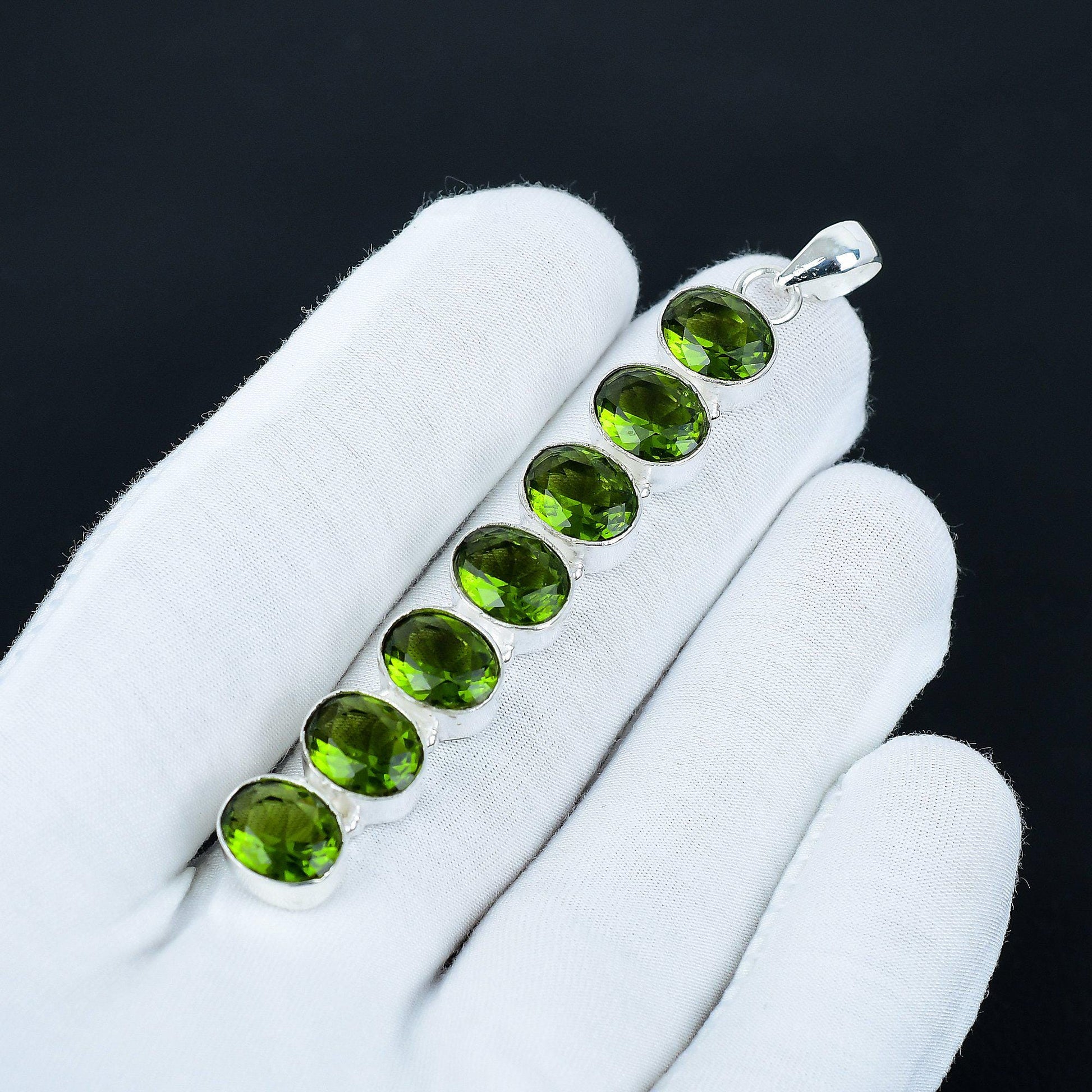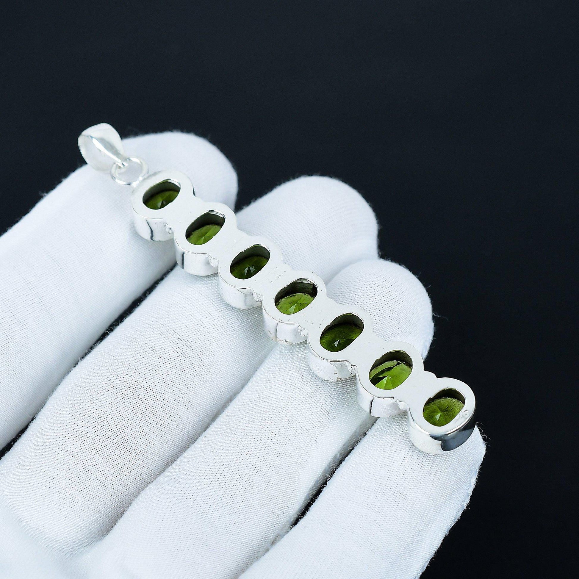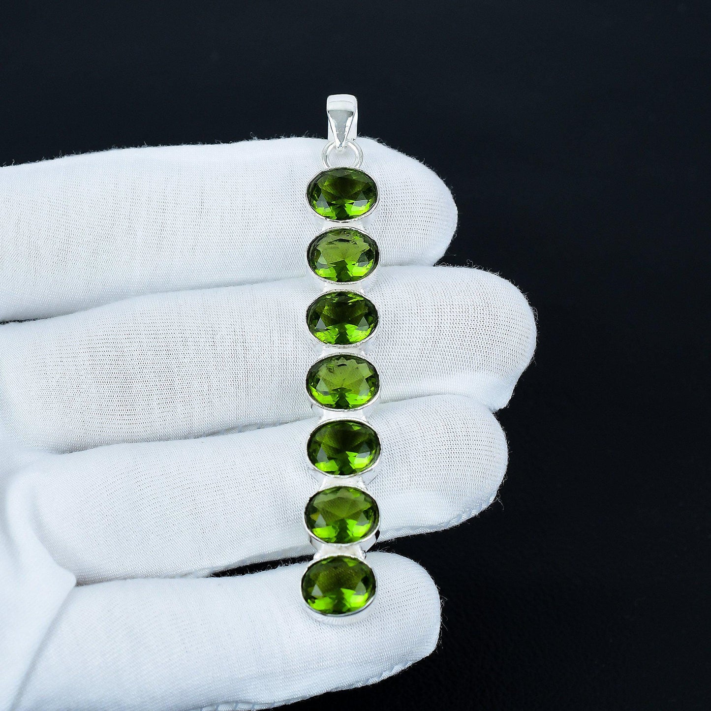 Elevate your style with our stunning silver pendant, featuring six captivating green gemstones that shimmer with every movement.