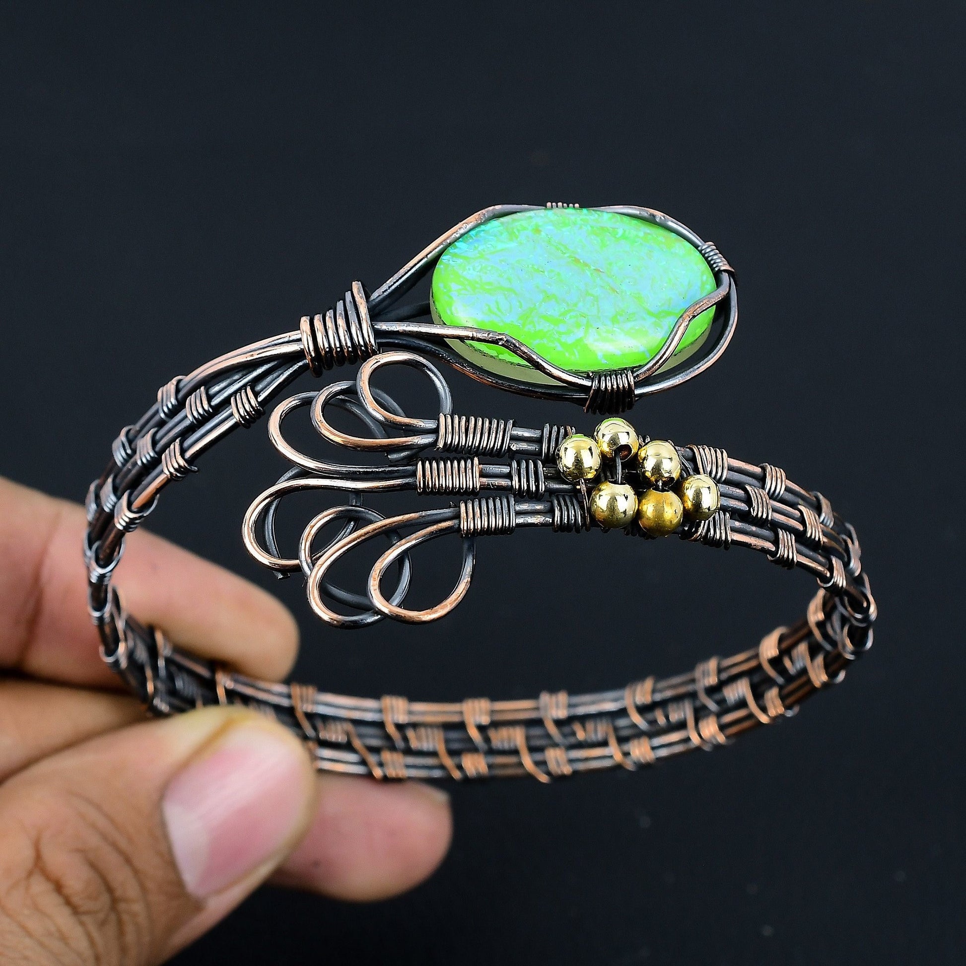 Enhance your style with this exquisite handmade bracelet, featuring a stunning green gemstone set amidst an intricate wire wrap design.