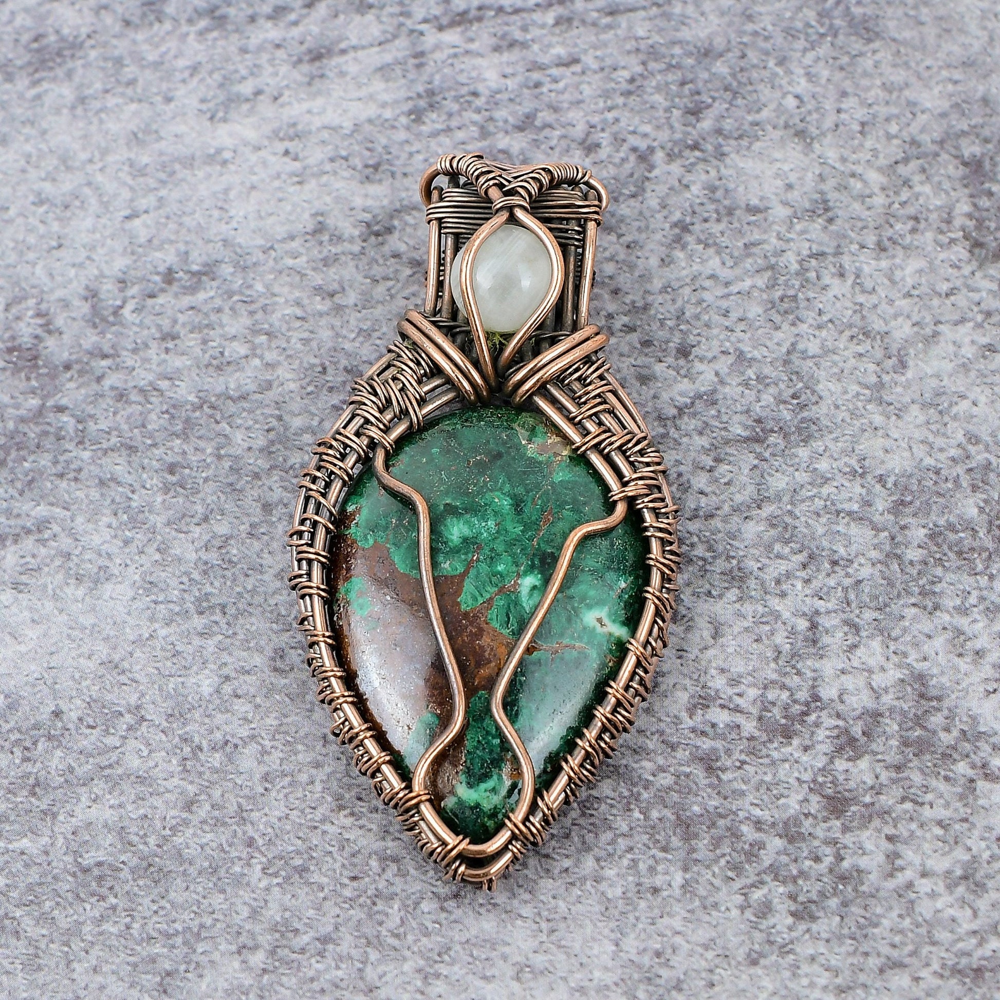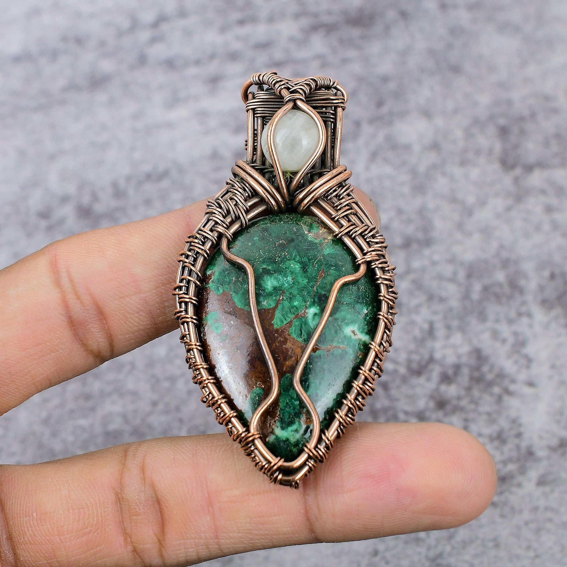 Each pendant is uniquely crafted, ensuring that no two pieces are exactly alike. The earthy tones of the copper beautifully complement the rich greens of the gemstone, creating a harmonious balance that is both eye-catching and sophisticated.