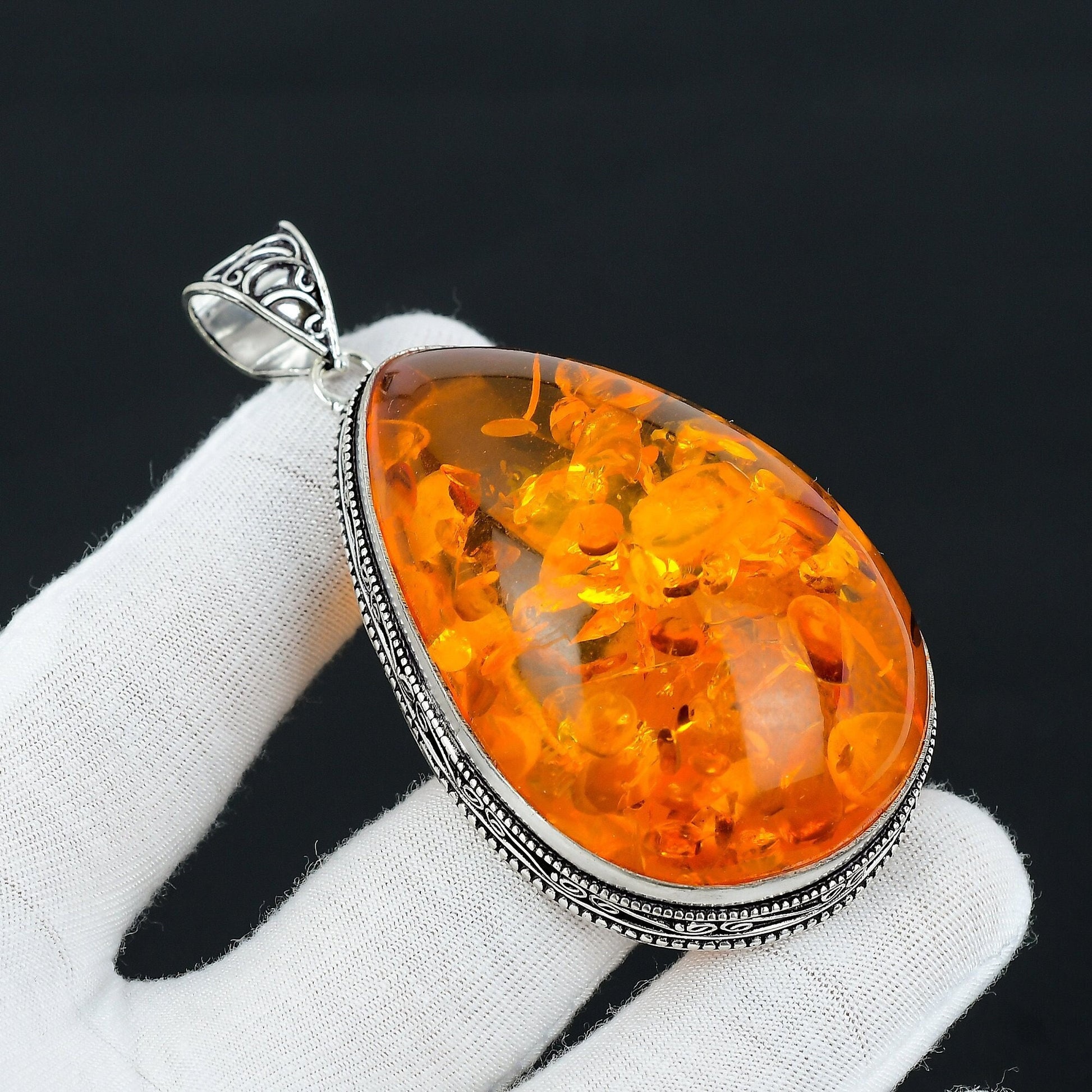 - Unique Design: Crafted with a stunning teardrop-shaped amber, each piece is uniquely set with intricate patterns and rich, warm hues.