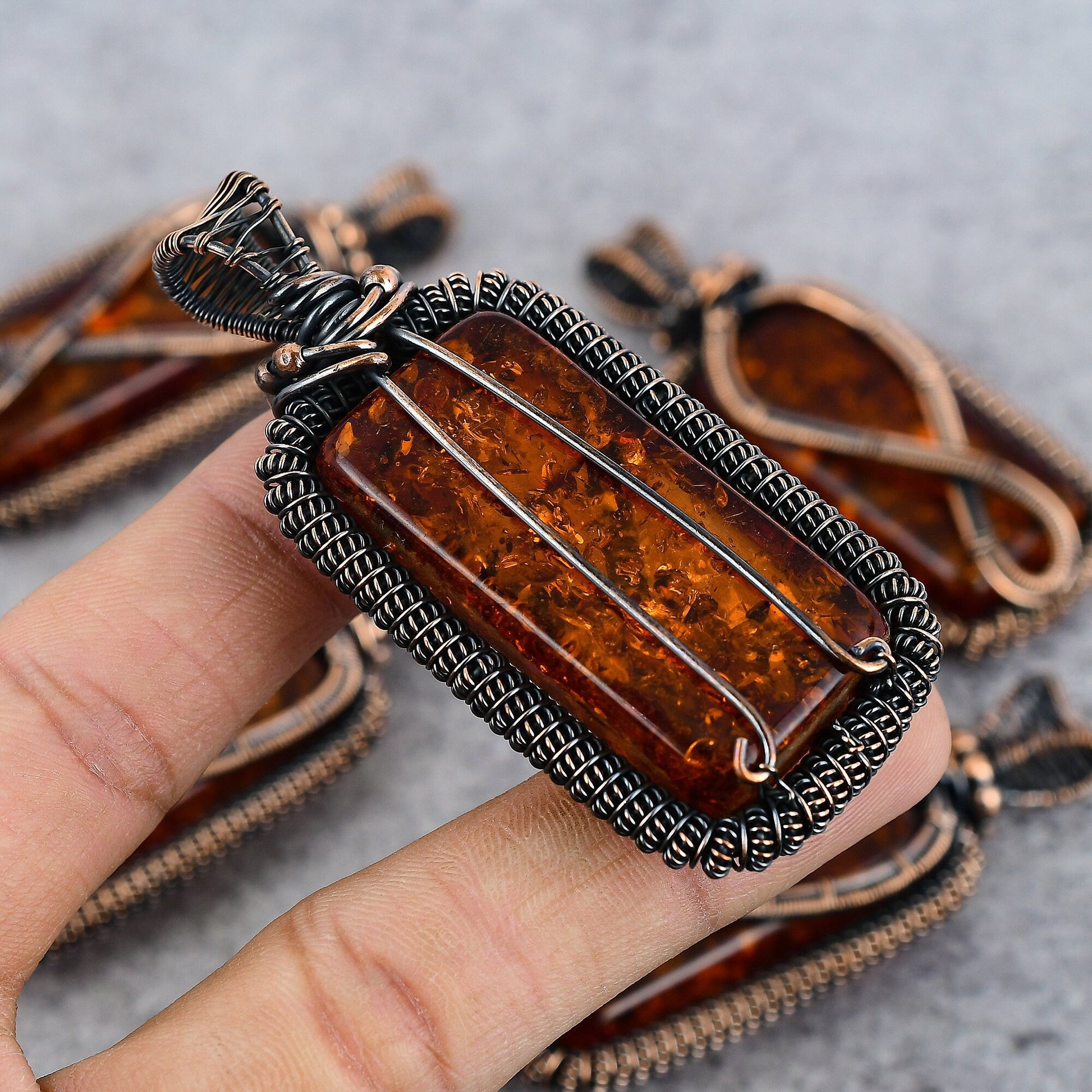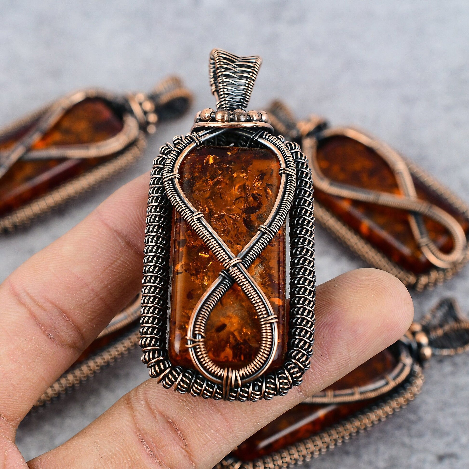 Design: This stunning pendant features a rich, amber-colored stone wrapped in intricate copper wire. The delicate infinity-inspired wire design enhances the natural beauty of the stone.