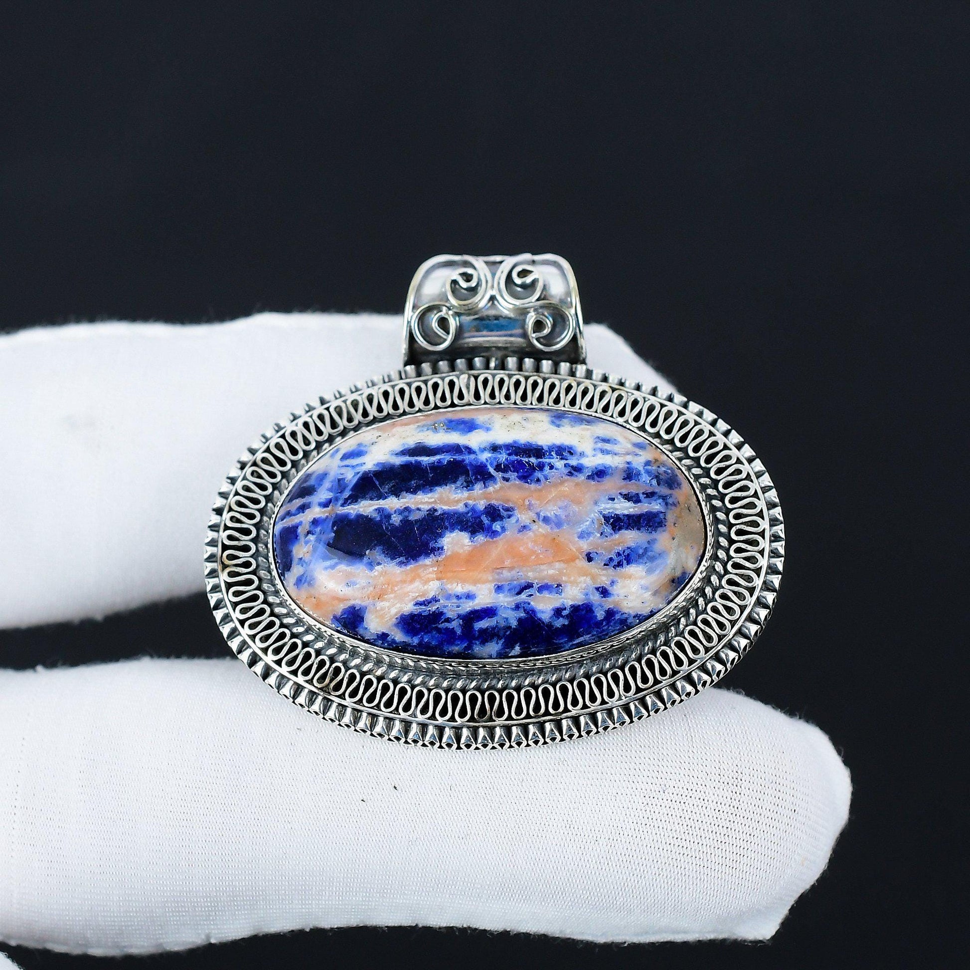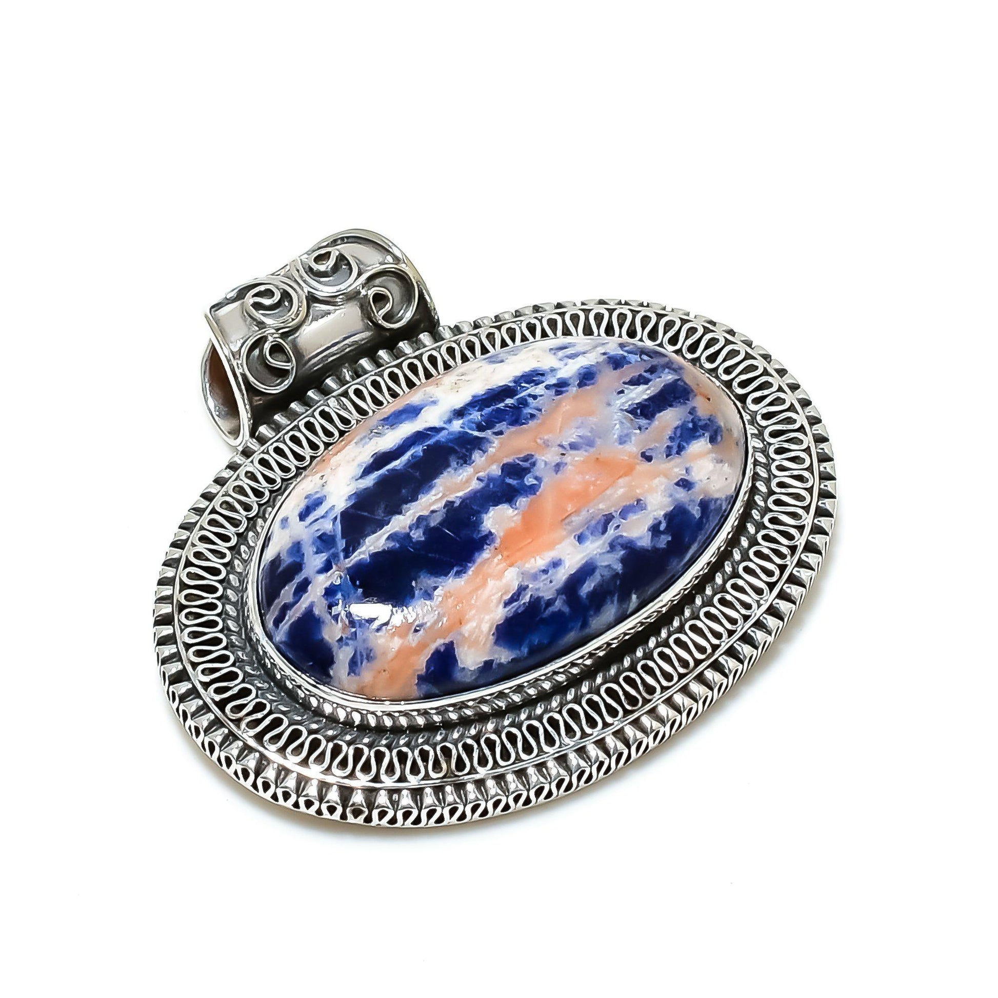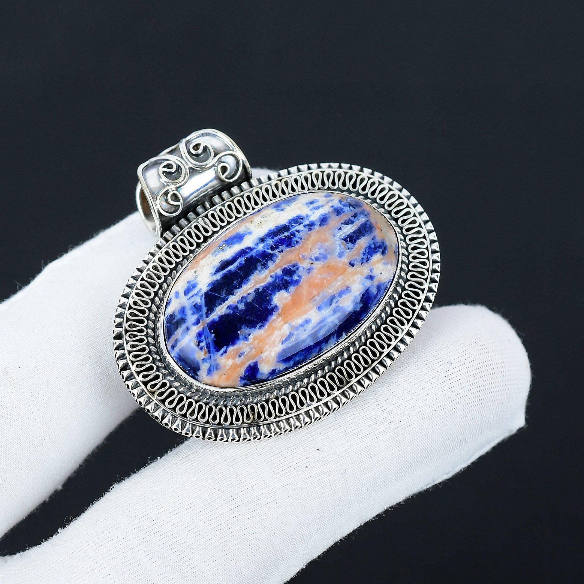 Elevate your style with our exquisite handcrafted pendant, featuring a stunning blue and orange sodalite stone.