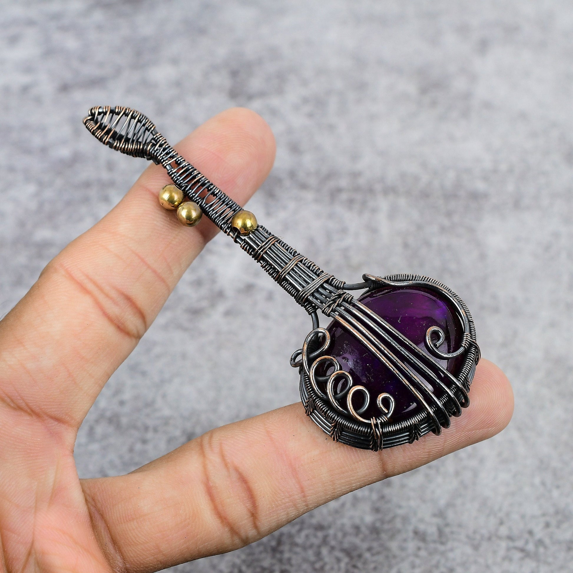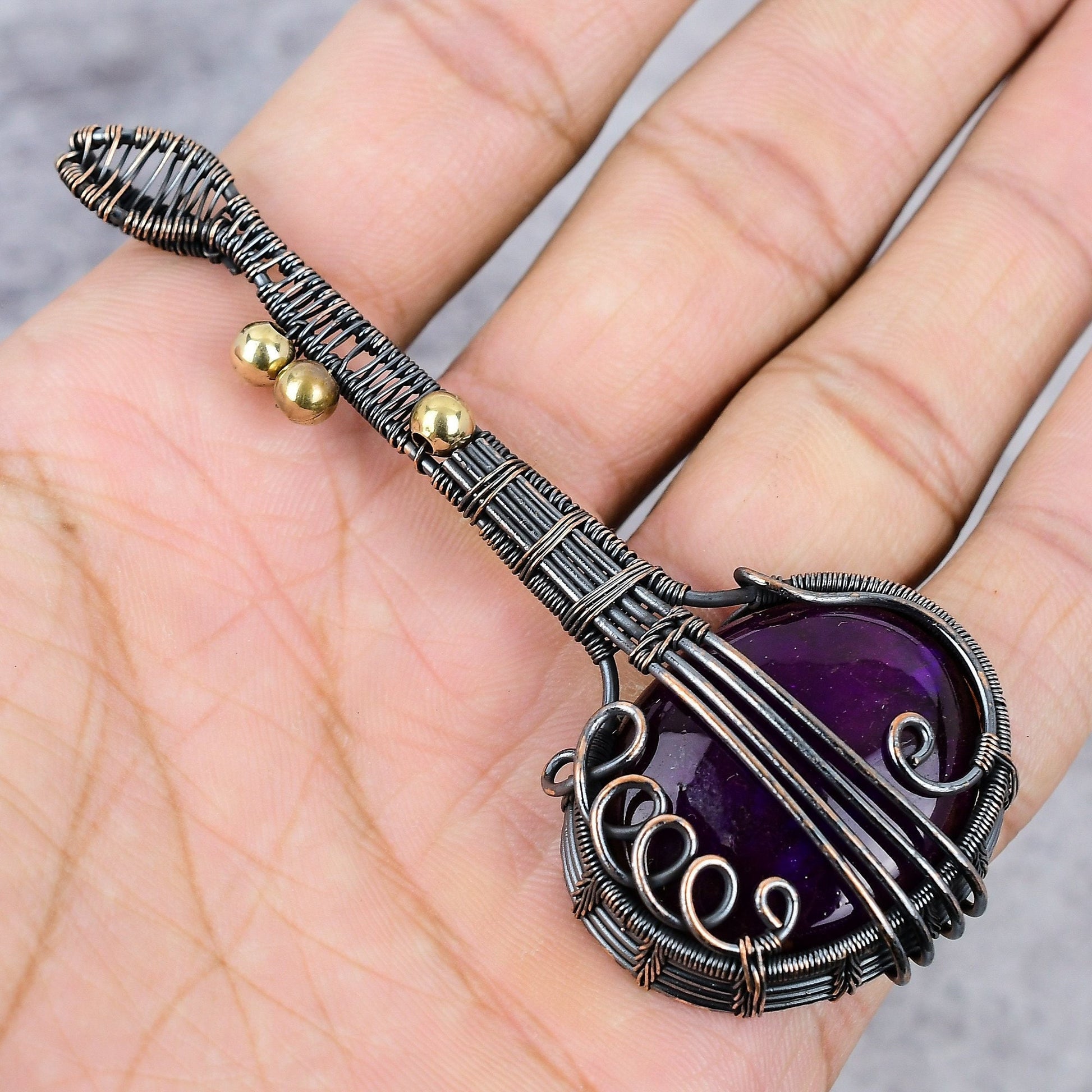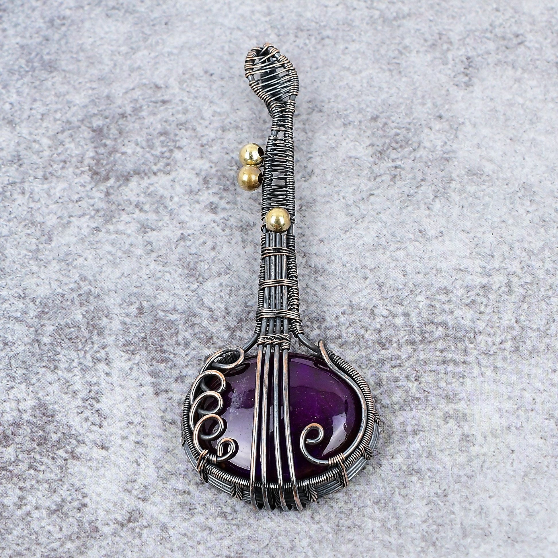 Featuring a rich purple gemstone, this piece is wrapped in intricately woven wire detailing, designed to capture the essence of timeless beauty.