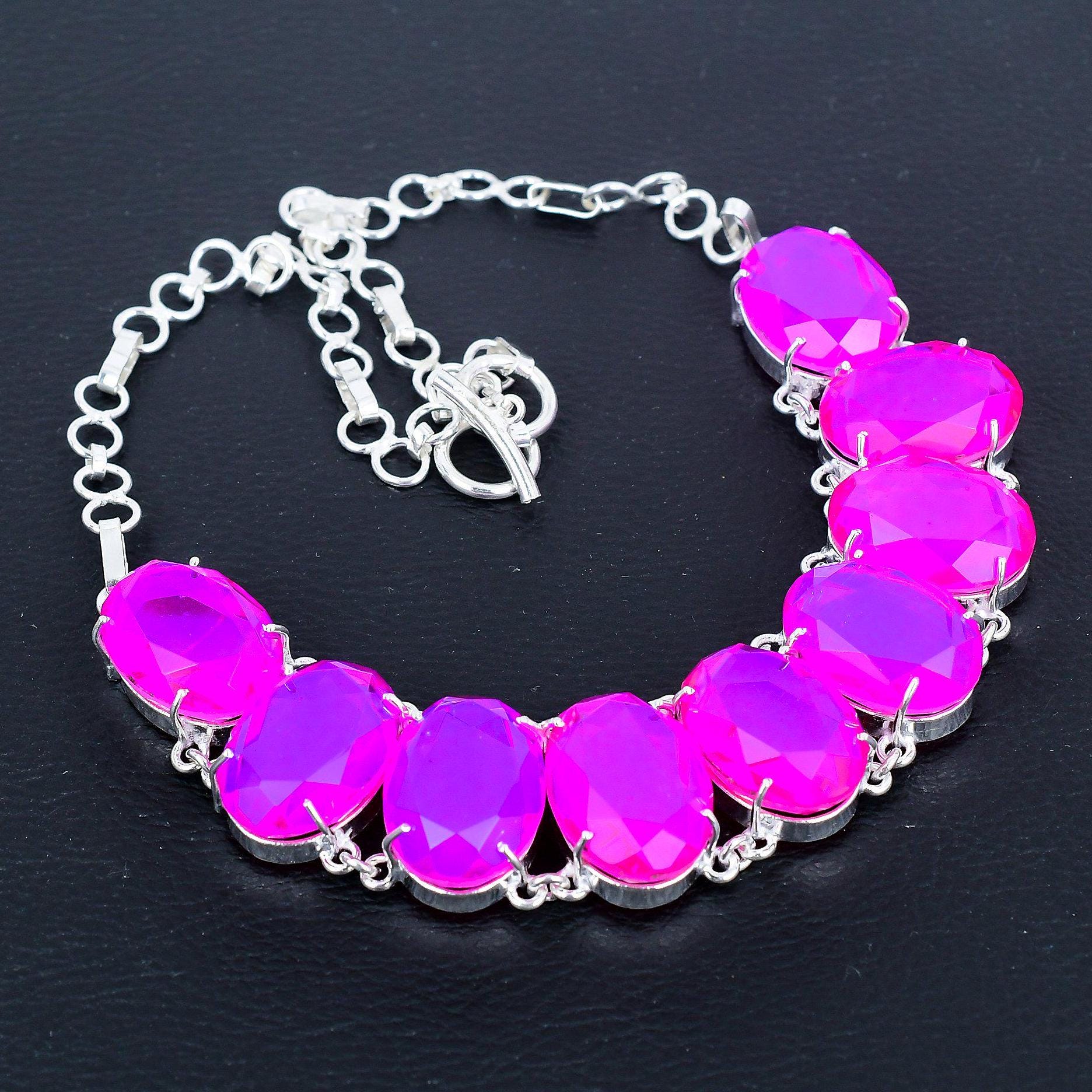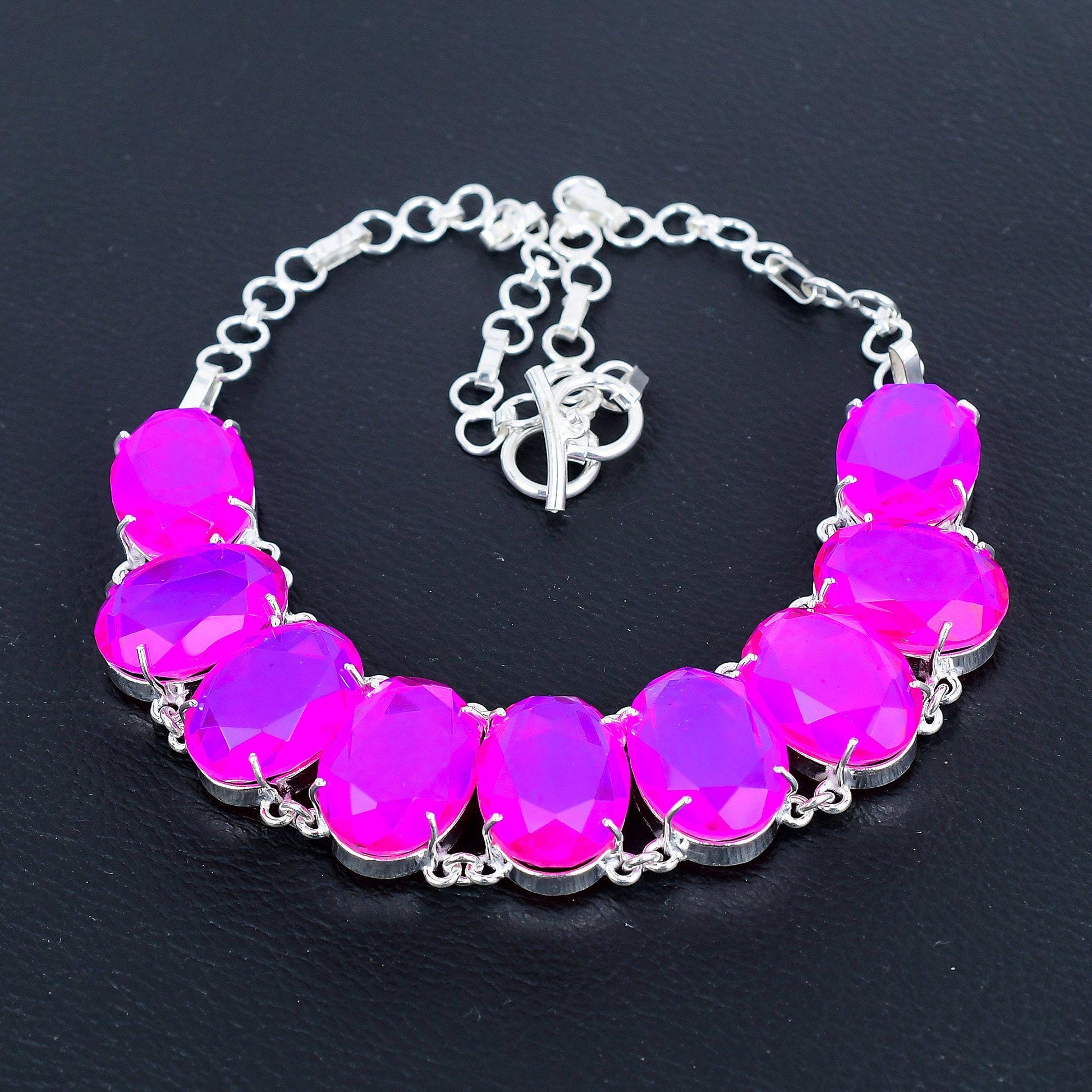 Introducing our stunning Pink Aura Bracelet, a perfect blend of elegance and boldness. Crafted with exquisite artistry, this bracelet features beautifully faceted, vibrant pink gemstones that catch and reflect light magnificently.