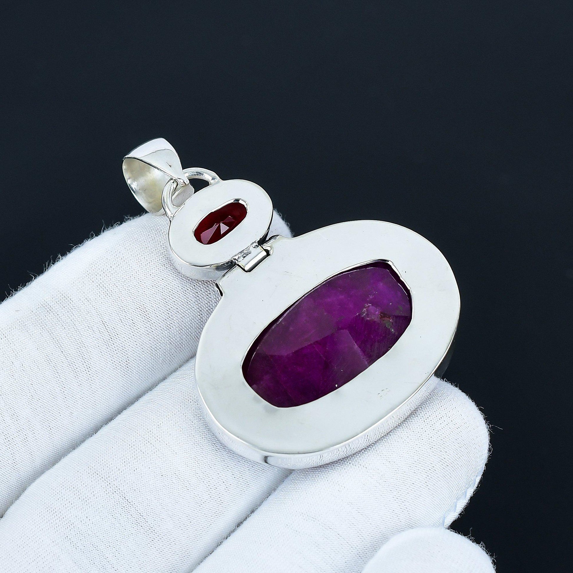 - Stunning combination of a vibrant purple and a radiant red gemstone, set in a sleek silver casing.