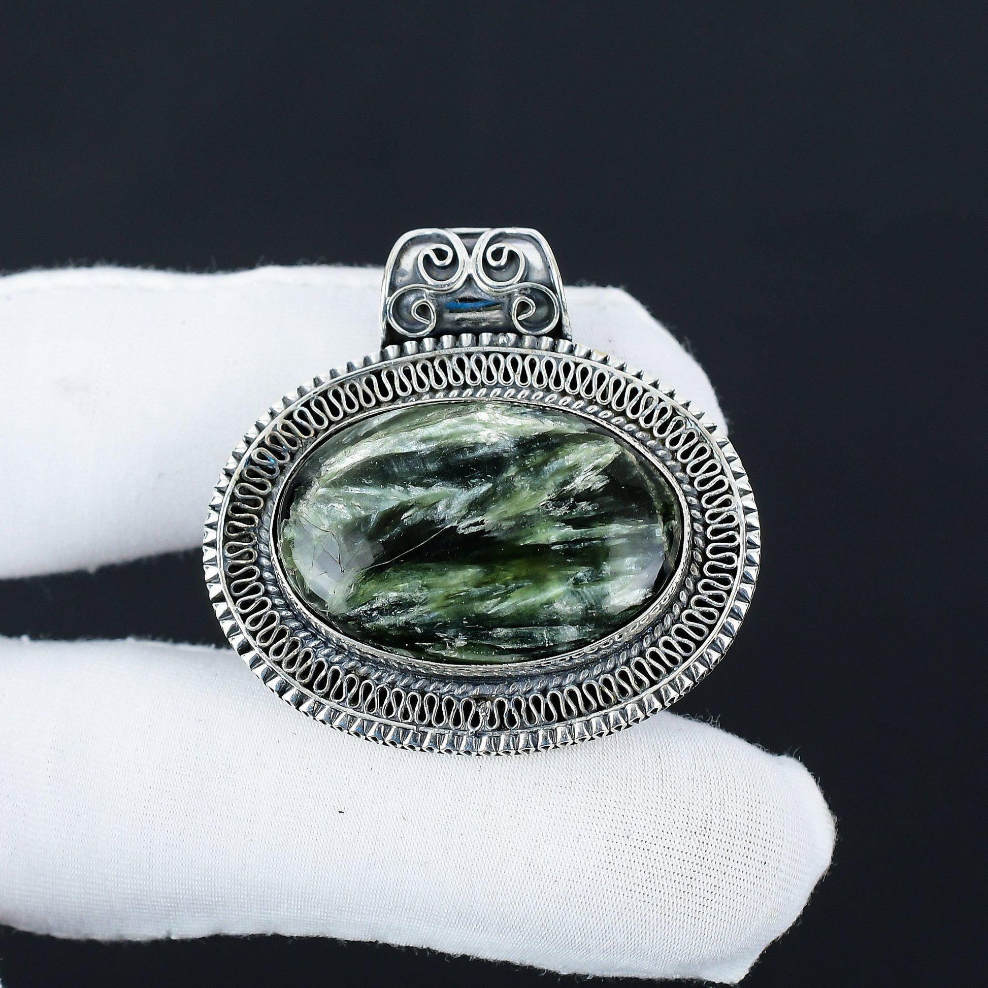 This exquisite piece features a lustrous green stone, meticulously set within an intricately detailed silver frame. The stone’s natural patterns add a touch of organic charm, making each pendant truly one-of-a-kind.