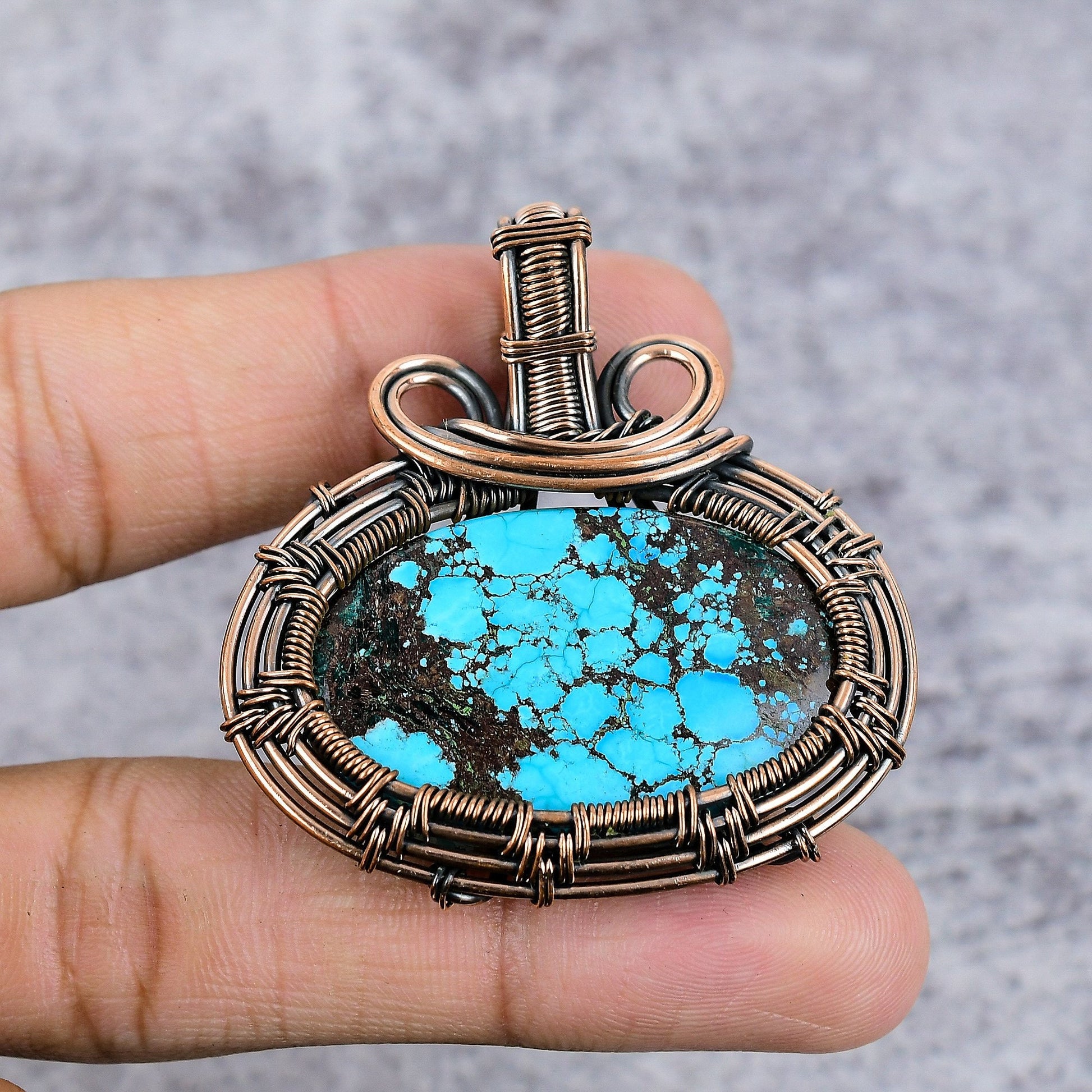 This striking pendant features a captivating turquoise stone, its natural matrix beautifully contrasting with its vibrant blues. Handcrafted with precision, it’s elegantly wrapped in antique copper wire, exhibiting an exquisite design and unmatched attention to detail.