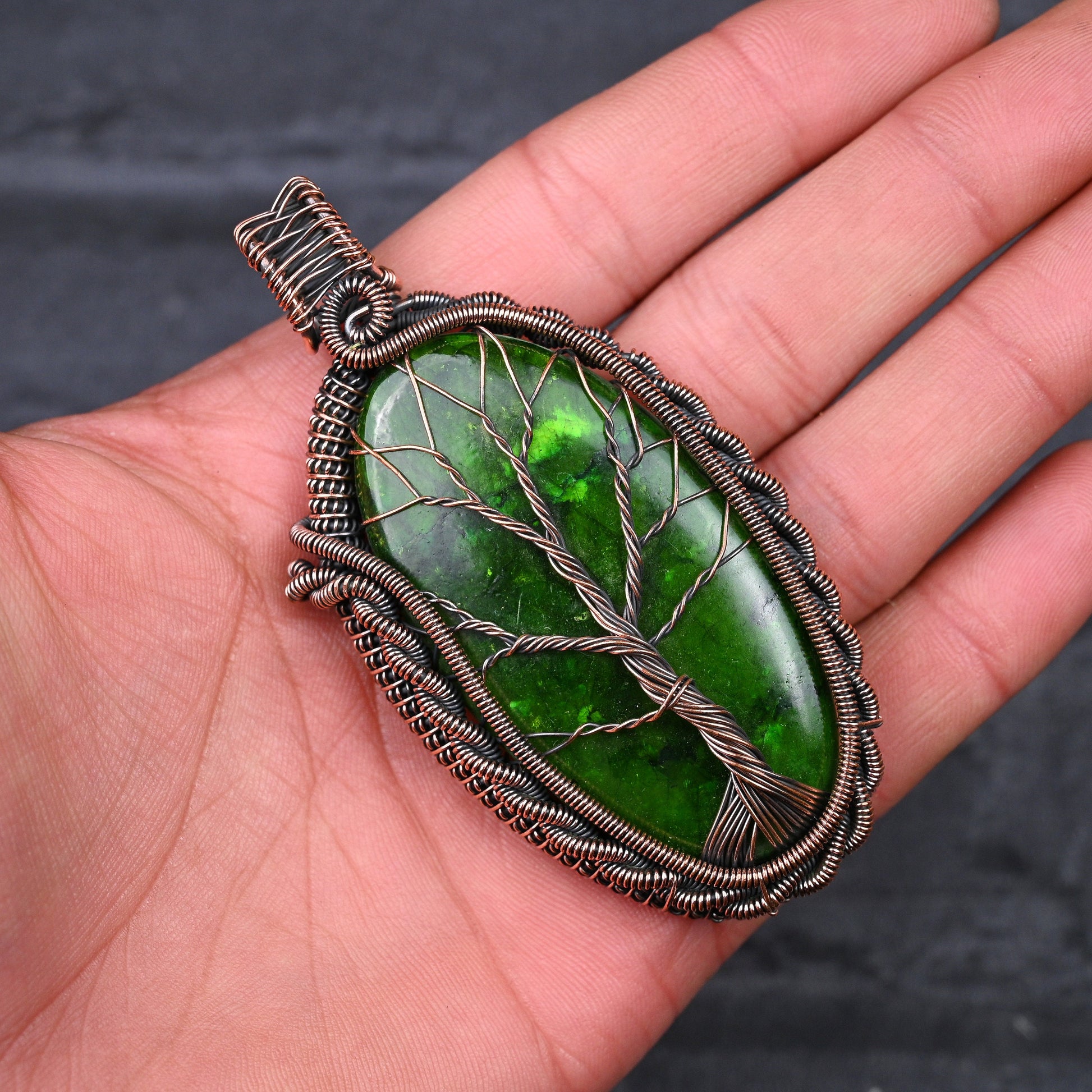 Handcrafted with intricate wire work, this pendant features a stunning green stone, symbolizing growth and renewal.