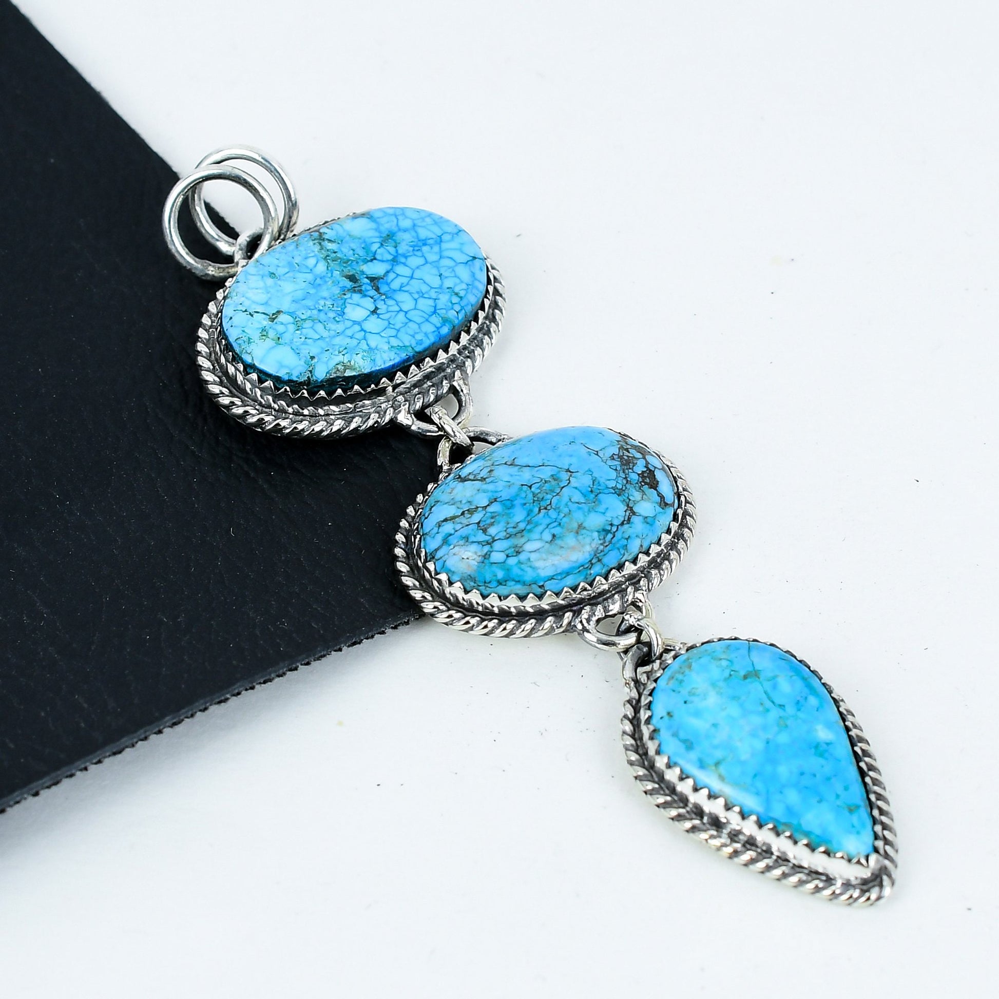 This stunning piece features three beautifully polished turquoise stones, each thoughtfully encased in intricate silver detailing. The vibrant blue hue of the stones is reminiscent of serene skies and tranquil waters, making it a perfect accessory for any occasion.