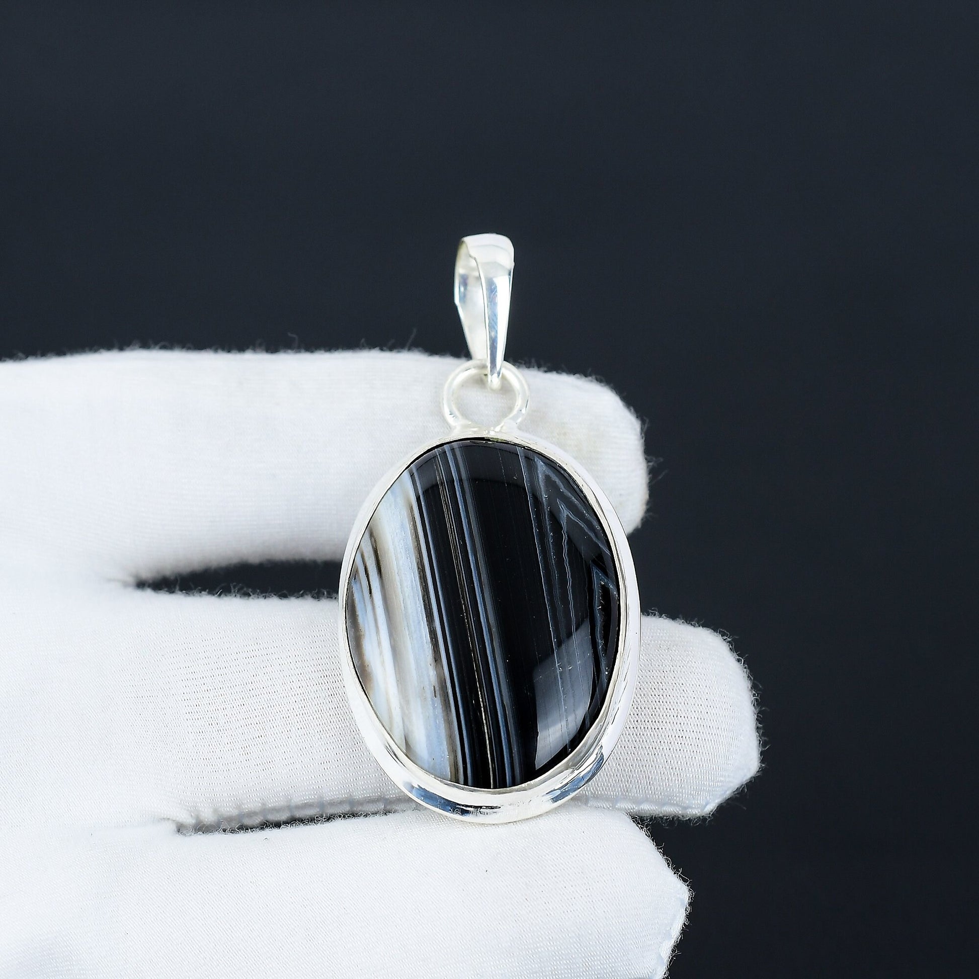 Set in a sleek sterling silver frame, the oval cabochon showcases natural, captivating bands of black and white.