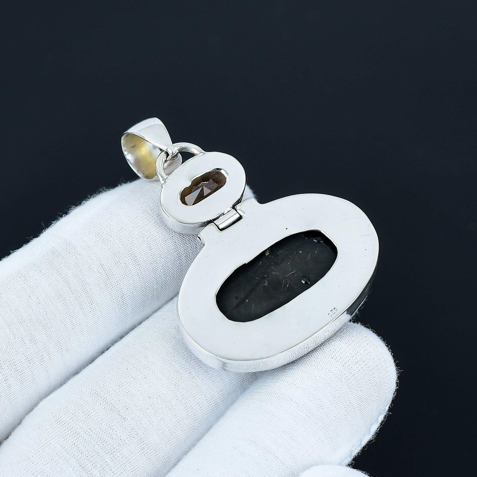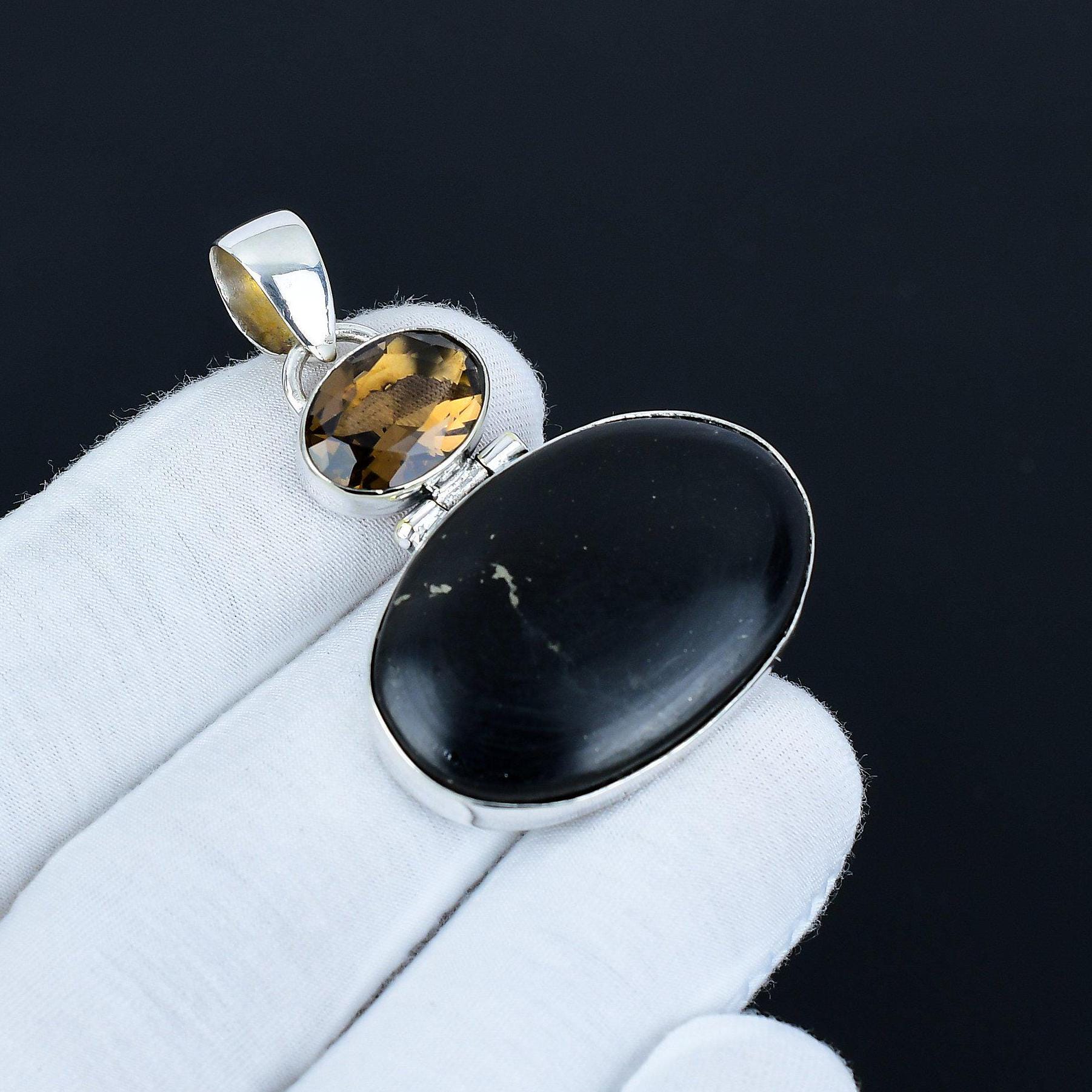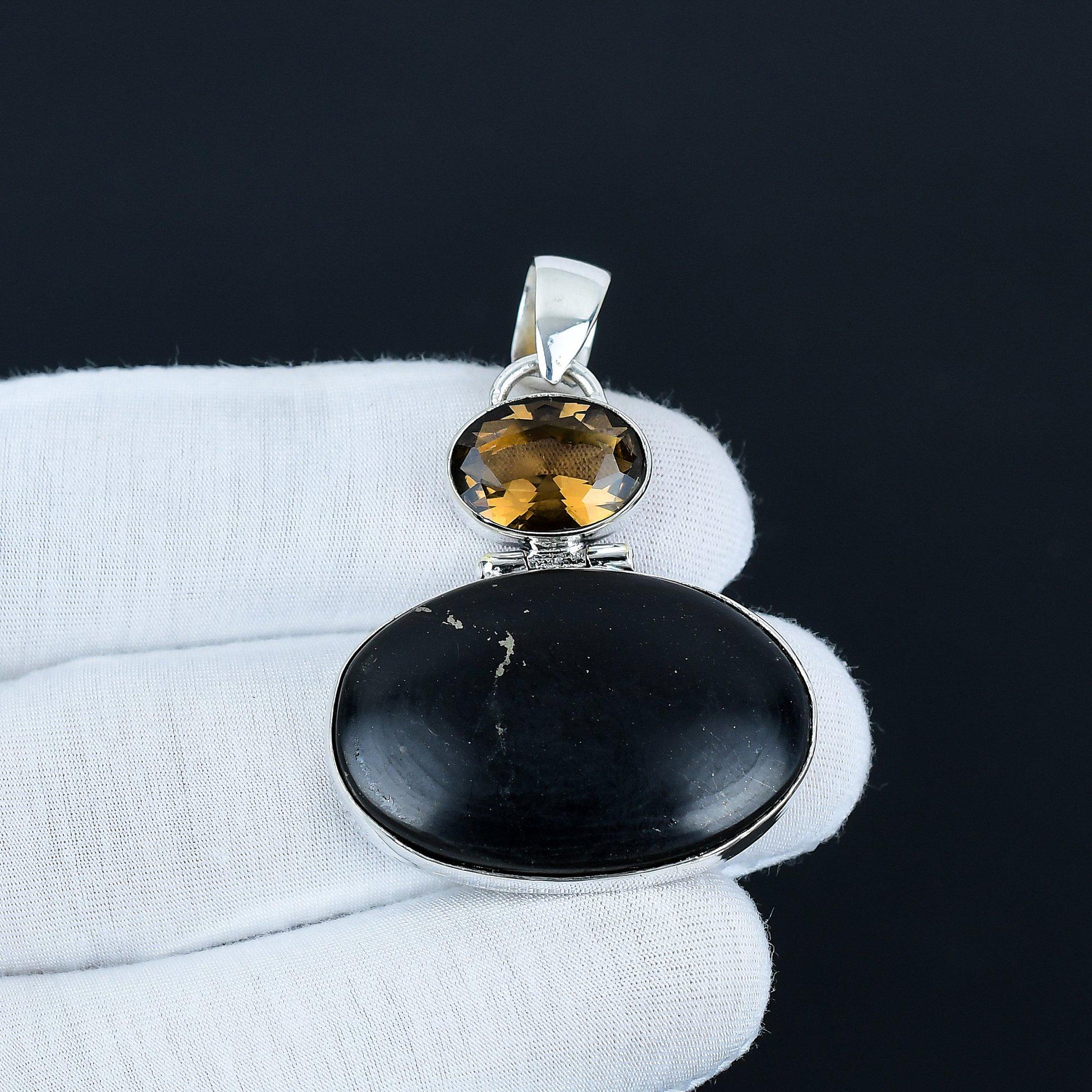 Design: This stunning pendant features a sleek black oval stone, paired elegantly with a faceted amber-toned gemstone, creating a striking contrast that captures attention.