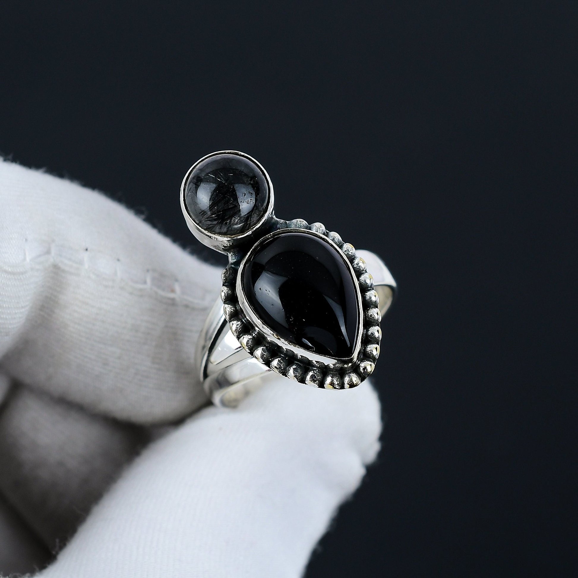 This stunning piece features a beautifully polished teardrop stone, complimented by a striking round gemstone, both set in a sleek silver band. The intricate detailing around the stones adds a touch of sophistication and allure.