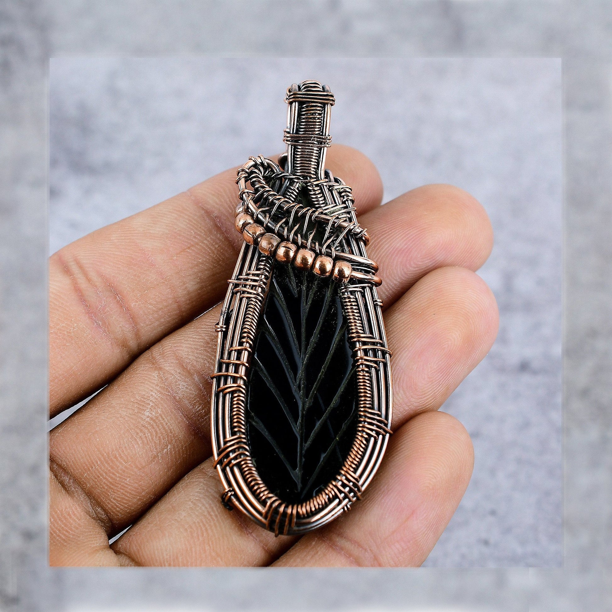 This unique piece features an intricately designed copper wire wrapping, beautifully encasing a deep black gemstone that exudes both mystery and sophistication.
