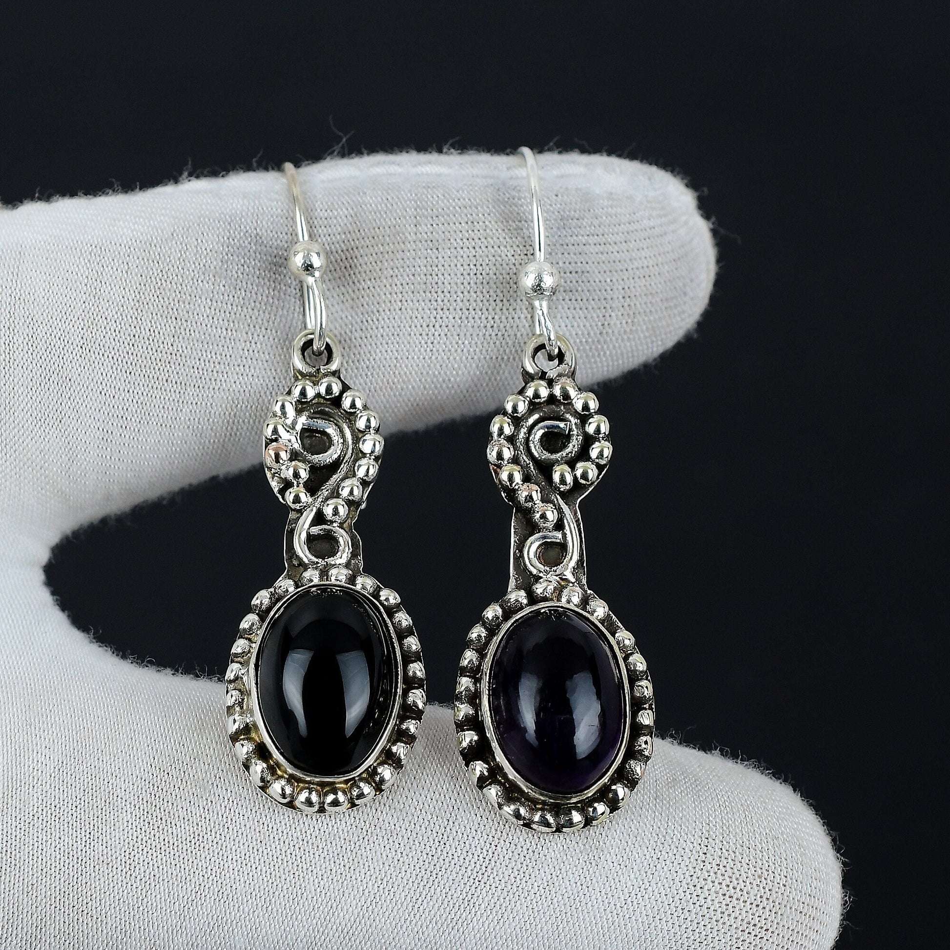 Design: Intricate silver patterns frame the deep, mesmerizing dark stones, creating a striking contrast that enhances their captivating allure. The detailed craftsmanship provides a sophisticated touch, perfect for elevating any ensemble.