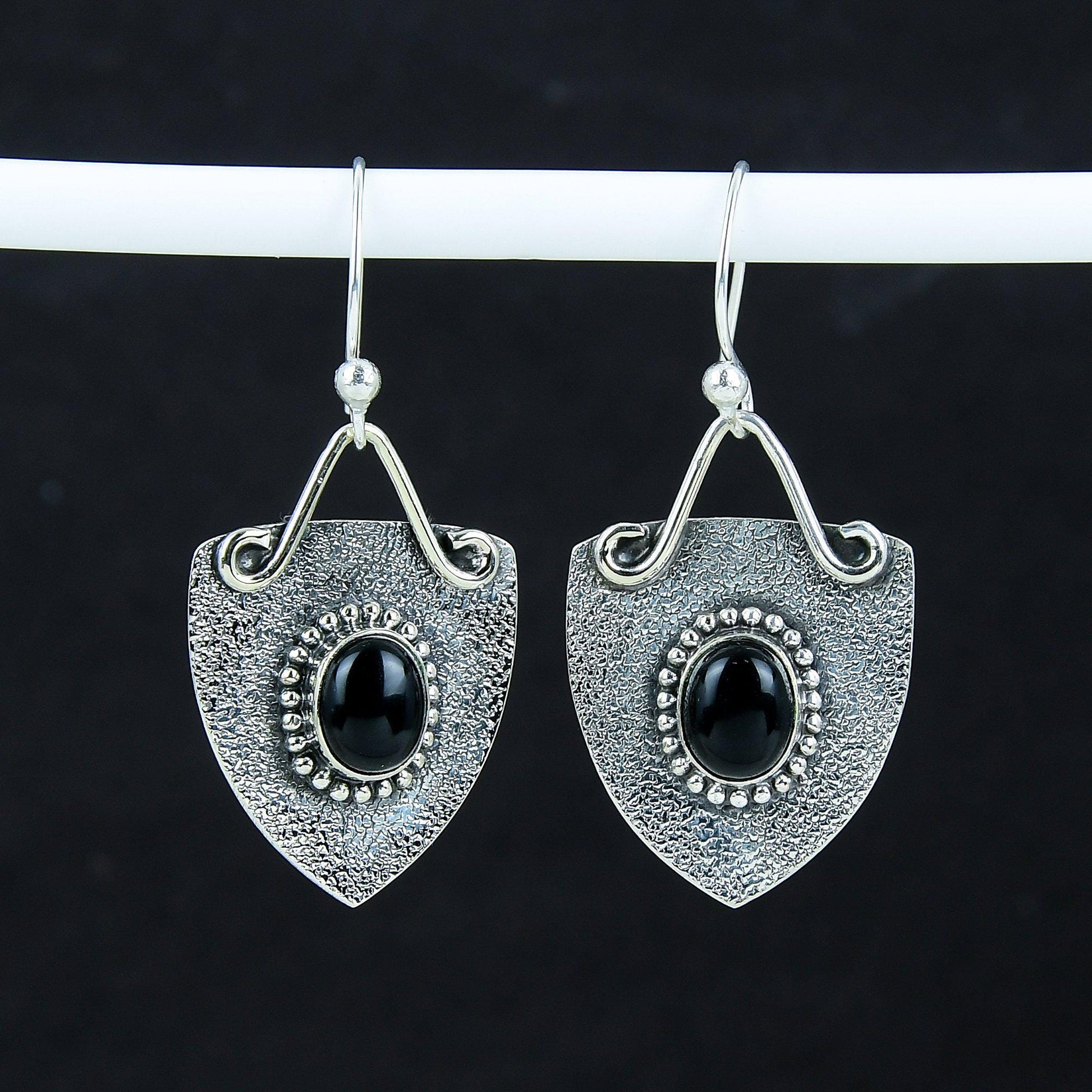 Introducing our exquisite Black Onyx Shield Earrings, a perfect blend of elegance and style. These earrings feature a striking black onyx stone set within a beautifully textured shield design.