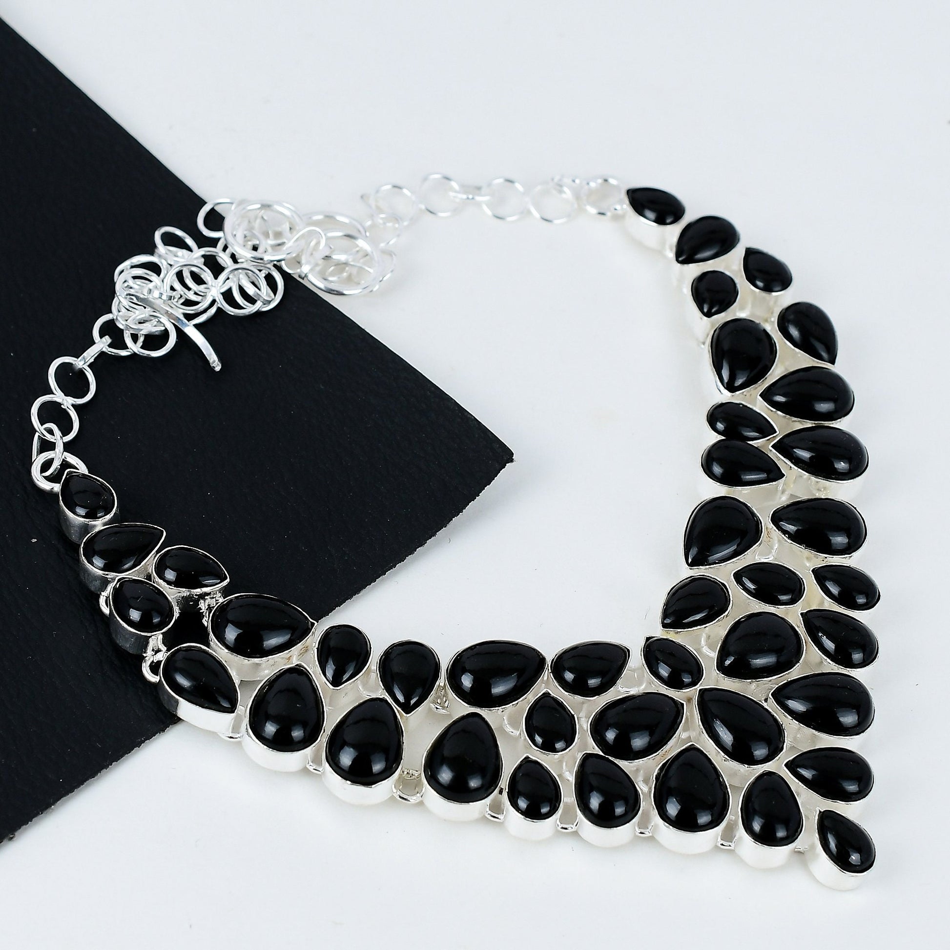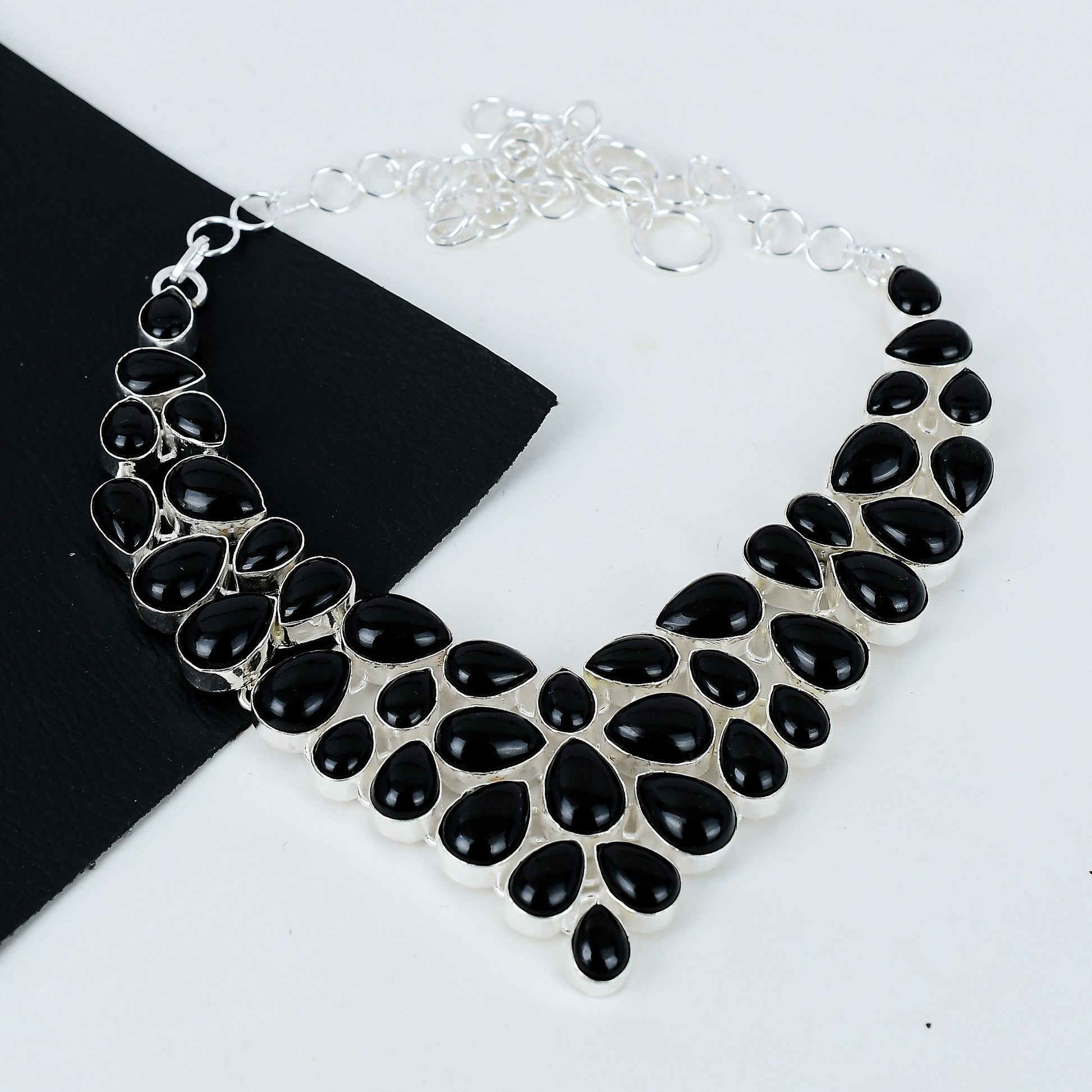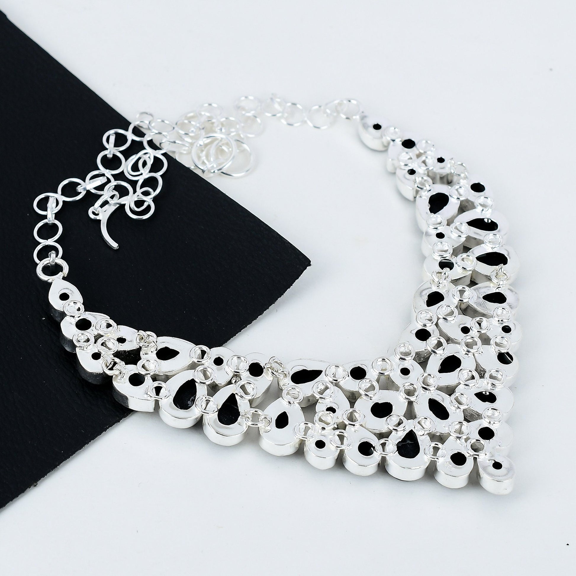 Elevate your elegance with this exquisite necklace, featuring bold, black teardrop stones set in a refined silver finish. Perfectly balancing contemporary style with classic sophistication, this piece is a must-have for any jewelry collection.