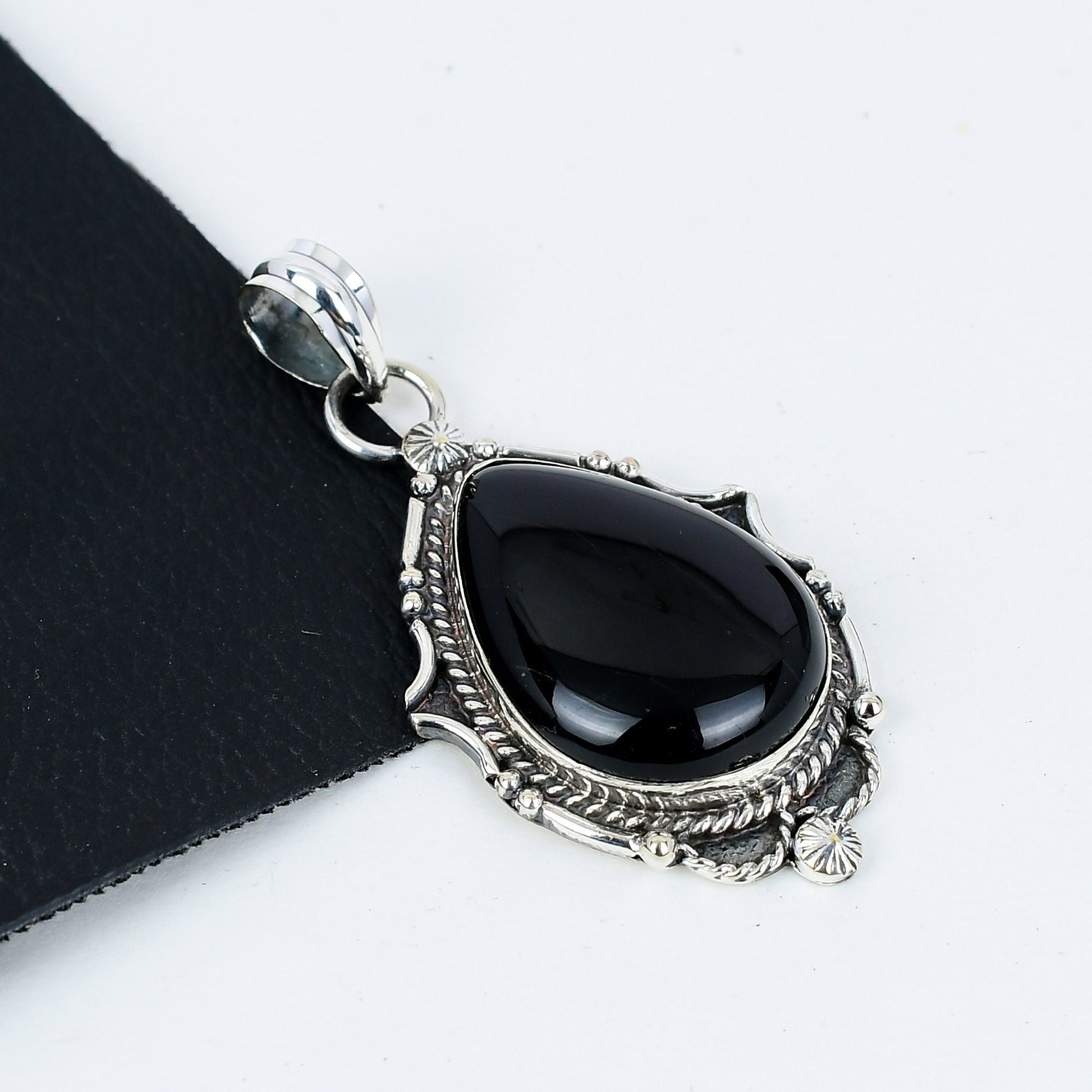 This stunning piece features a teardrop-shaped black onyx stone, set in a beautifully detailed silver casing.