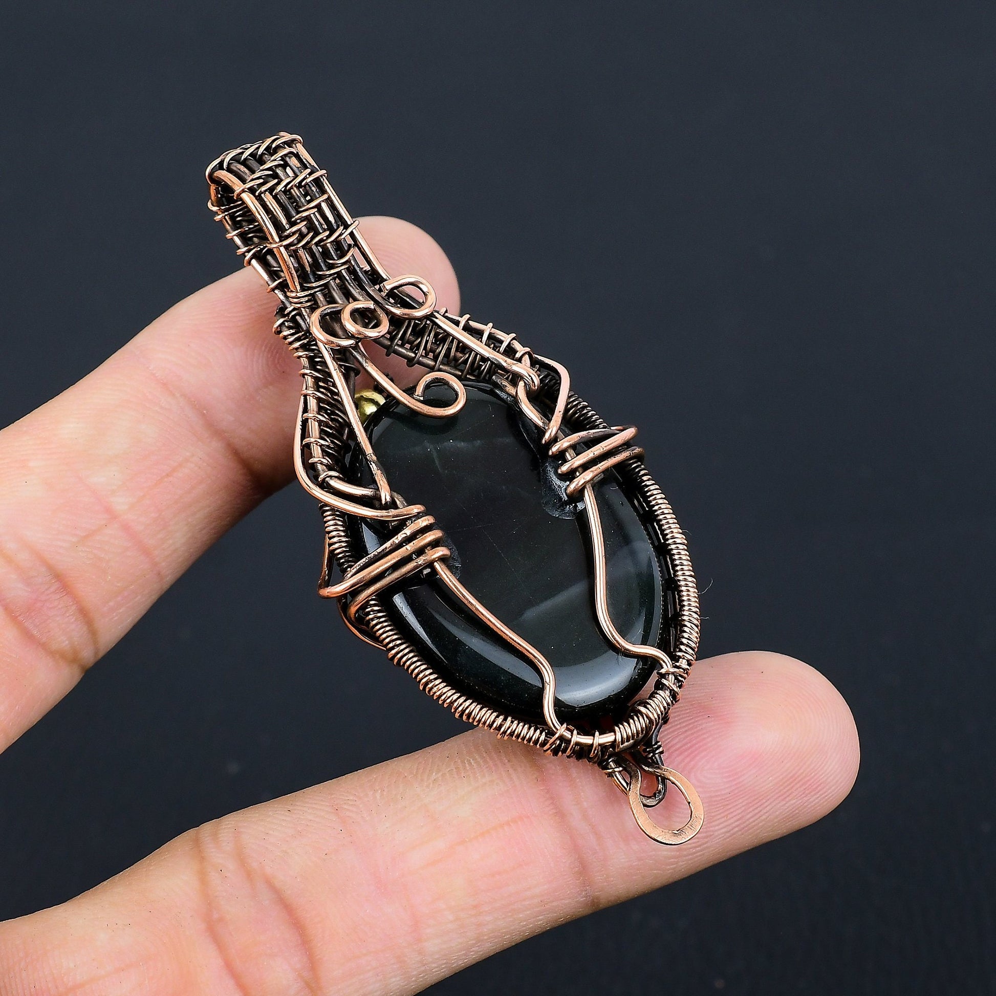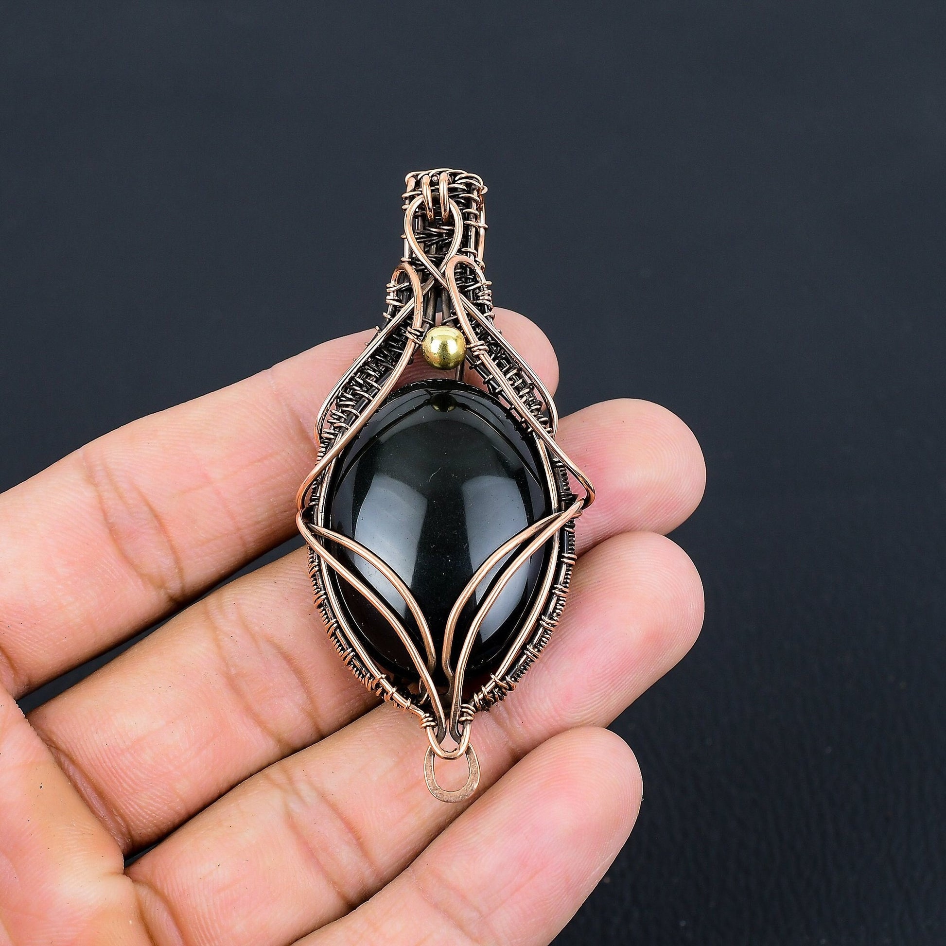 This exquisite piece features a captivating black gemstone, expertly wrapped in intricate copper wire. The harmonious blend of bold black and warm copper creates a striking contrast that is sure to draw attention and admiration.