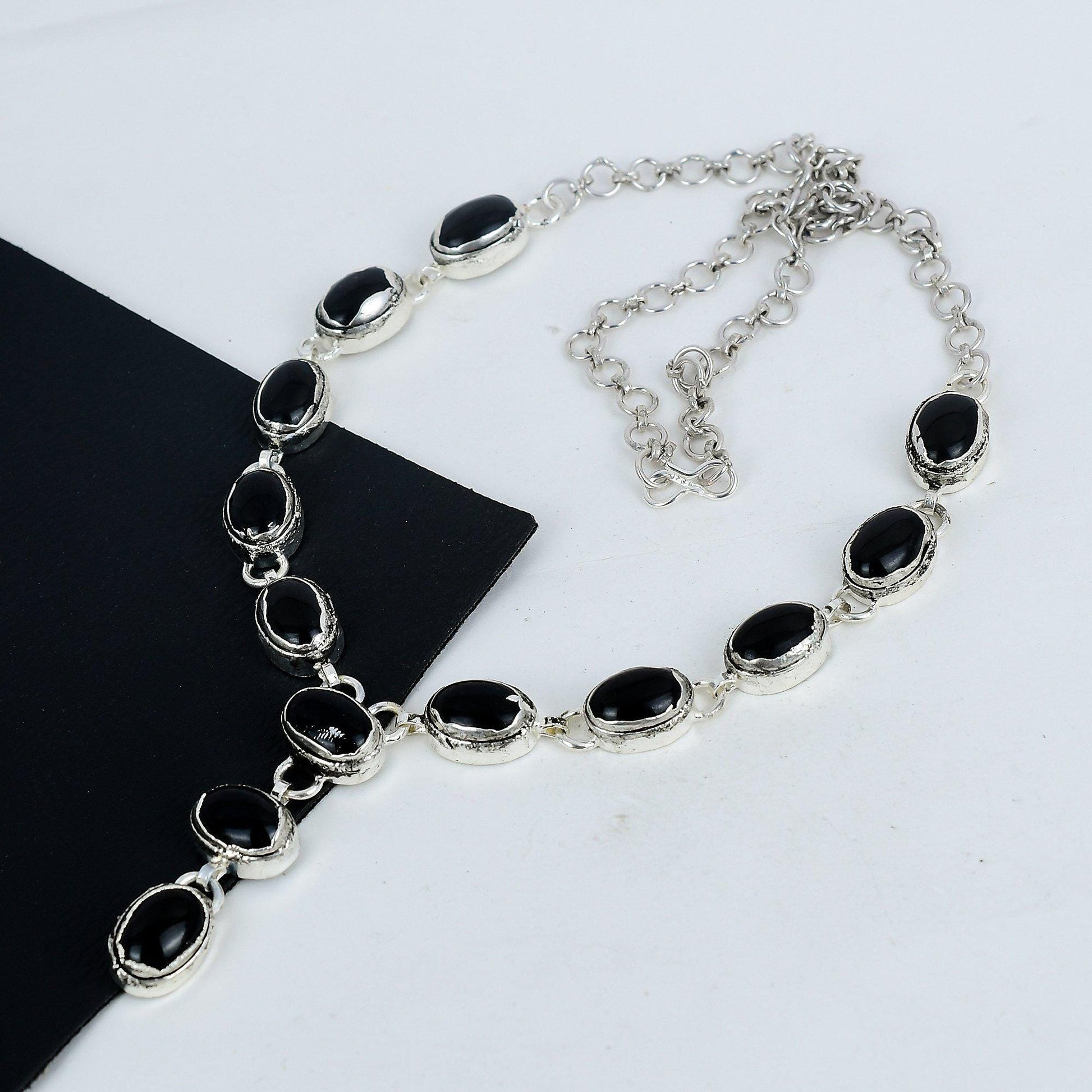 Elevate your style with this exquisite black onyx necklace, a perfect blend of elegance and sophistication. This luxurious piece features polished black onyx stones, beautifully set in a silver-tone chain, creating a striking contrast that captures attention.
