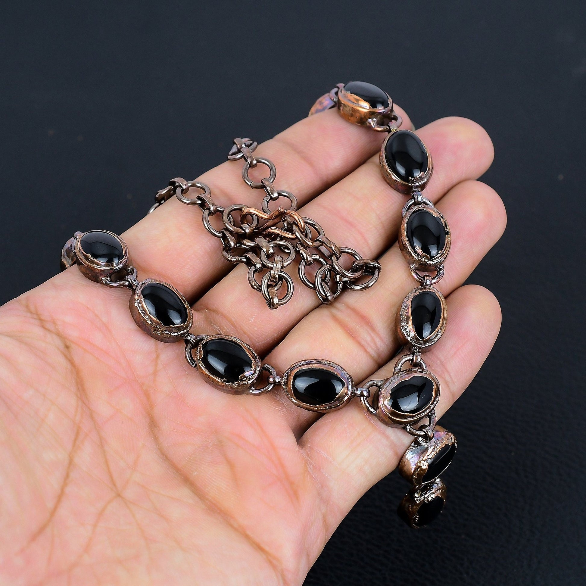 The deep black hue of the stones provides a striking contrast against the antiqued metal, creating a bold yet sophisticated look that complements any outfit.