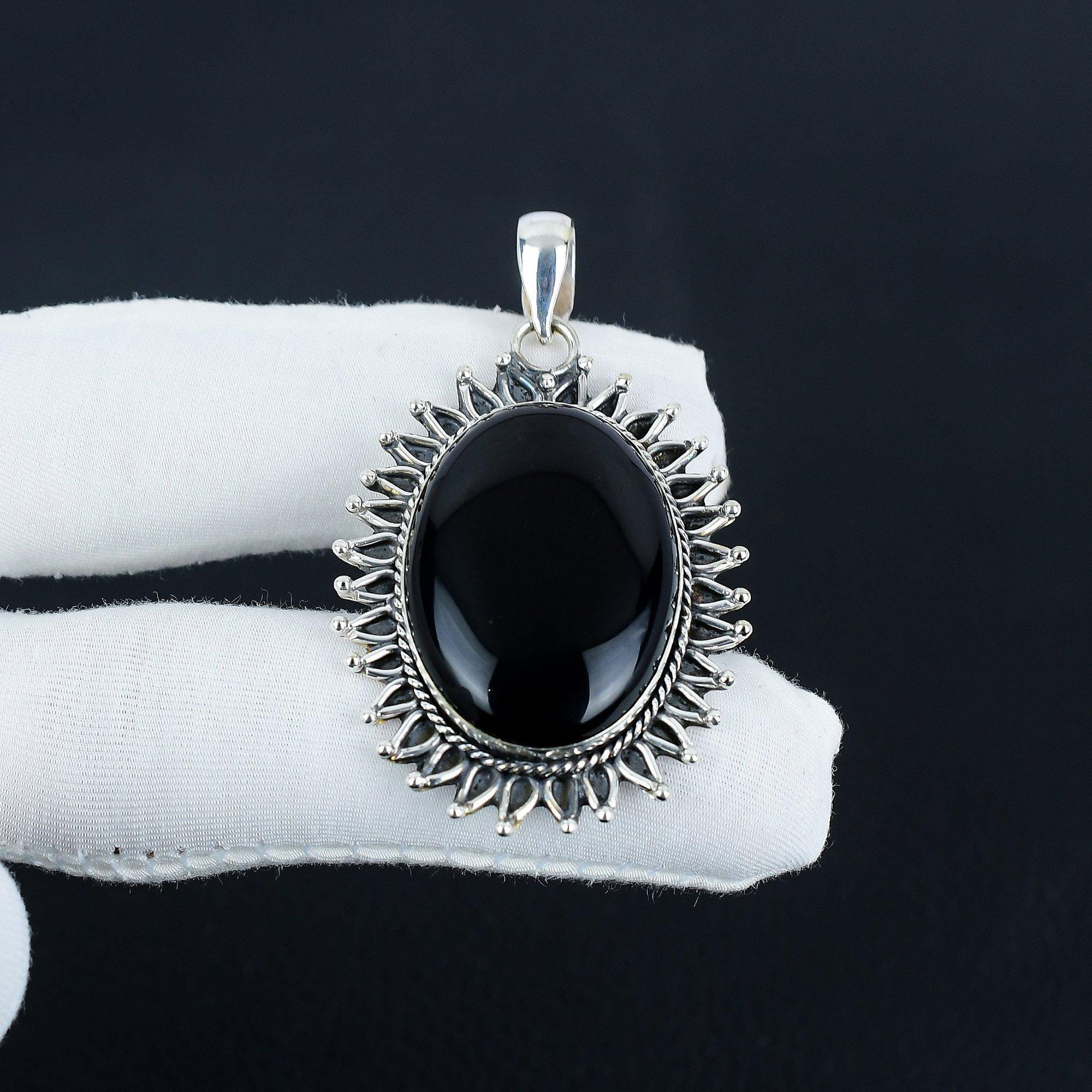 Introducing our exquisite Oval Onyx Pendant, a true statement piece that embodies elegance and sophistication. This stunning pendant showcases a captivating black onyx gemstone, expertly set in a meticulously crafted sterling silver frame.