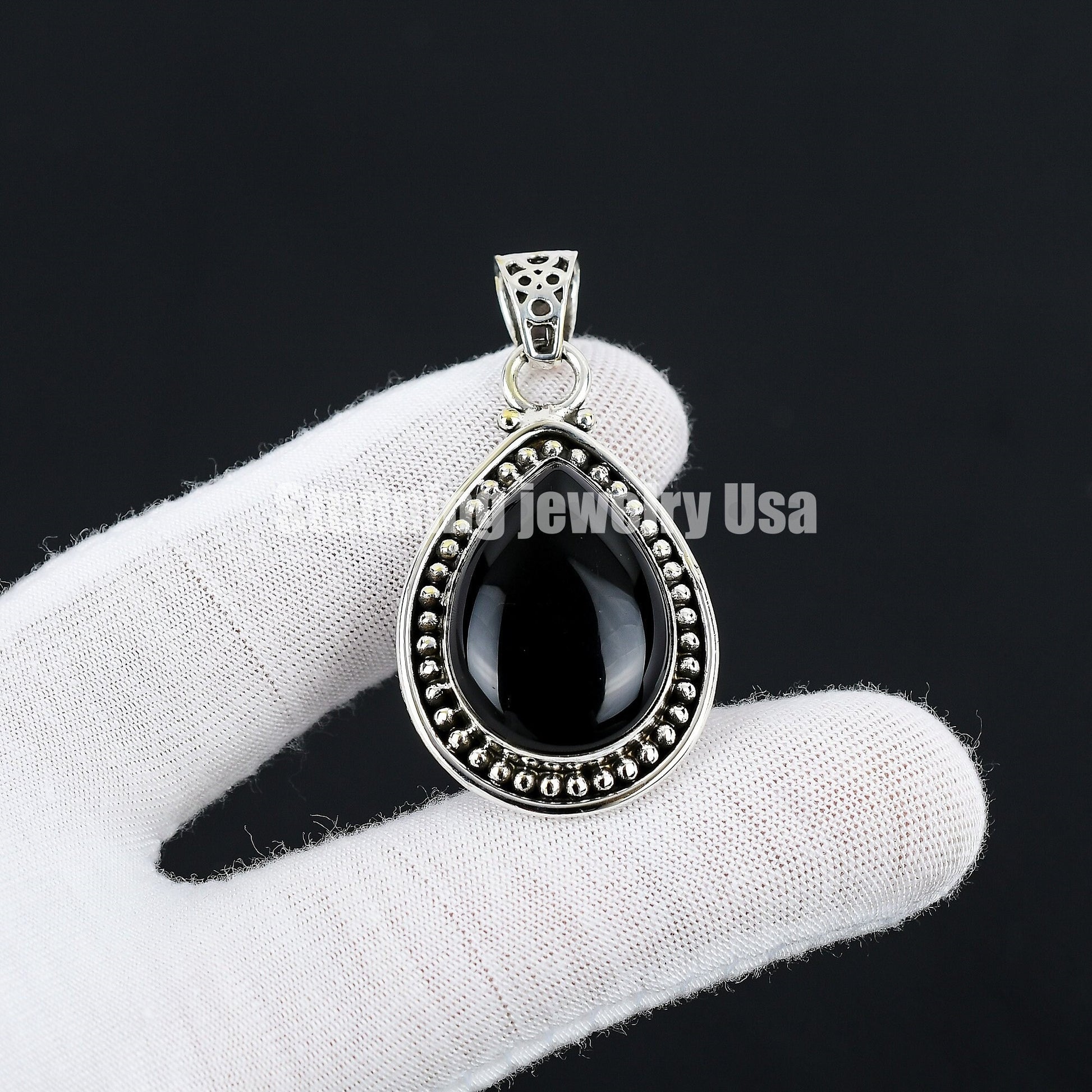 Enhance your elegance with our exquisite teardrop pendant, expertly crafted with a stunning black gemstone.