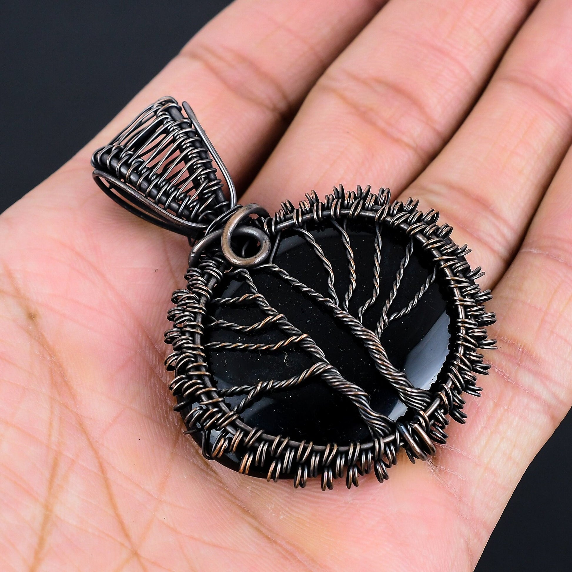 Featuring a stunning black onyx stone, this piece is meticulously wrapped in high-quality dark copper wire.