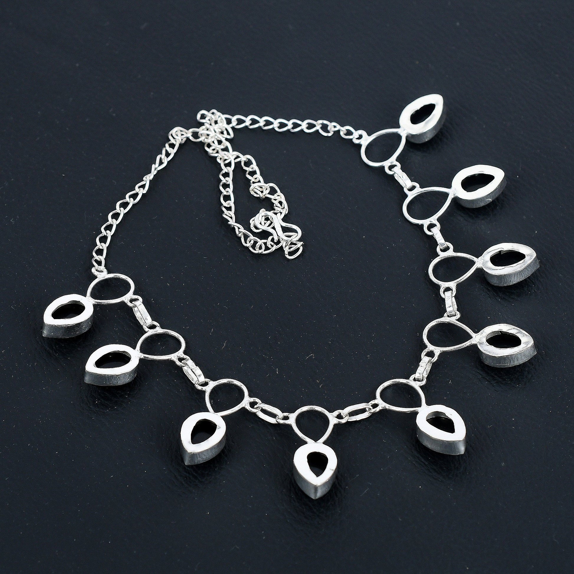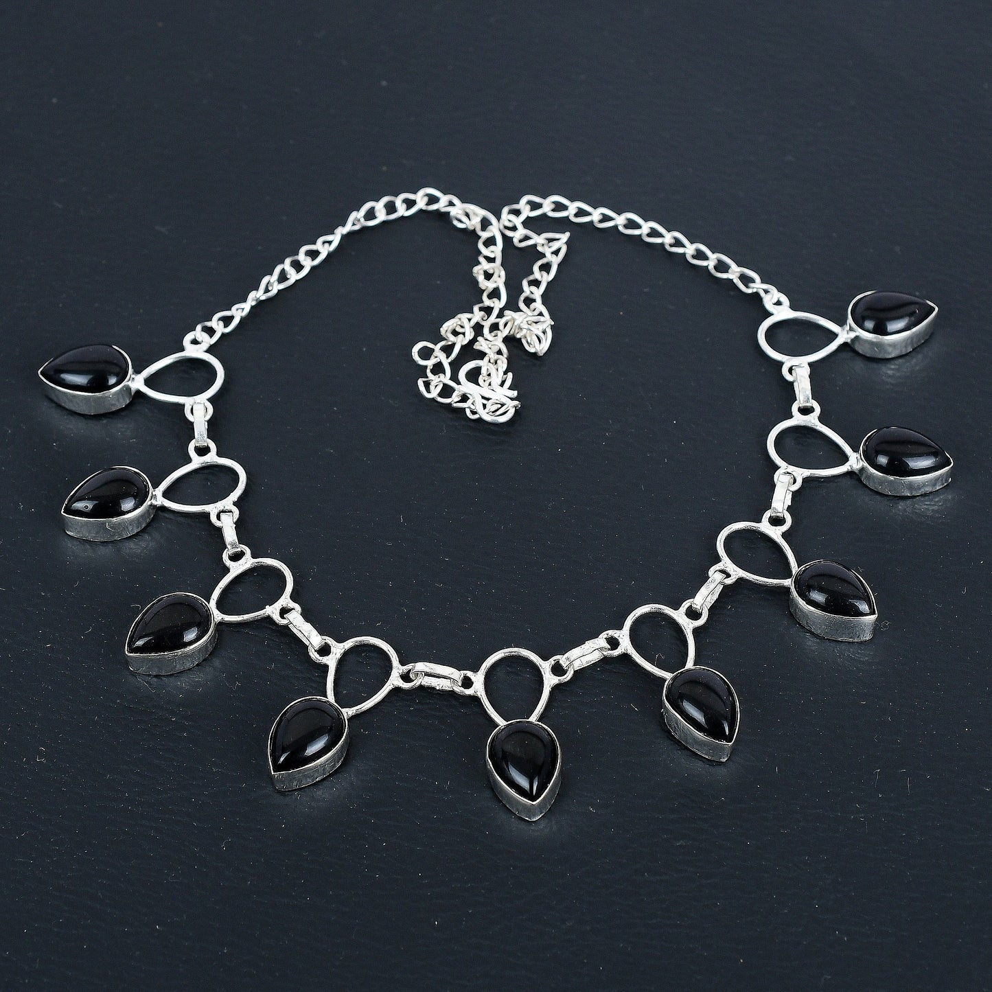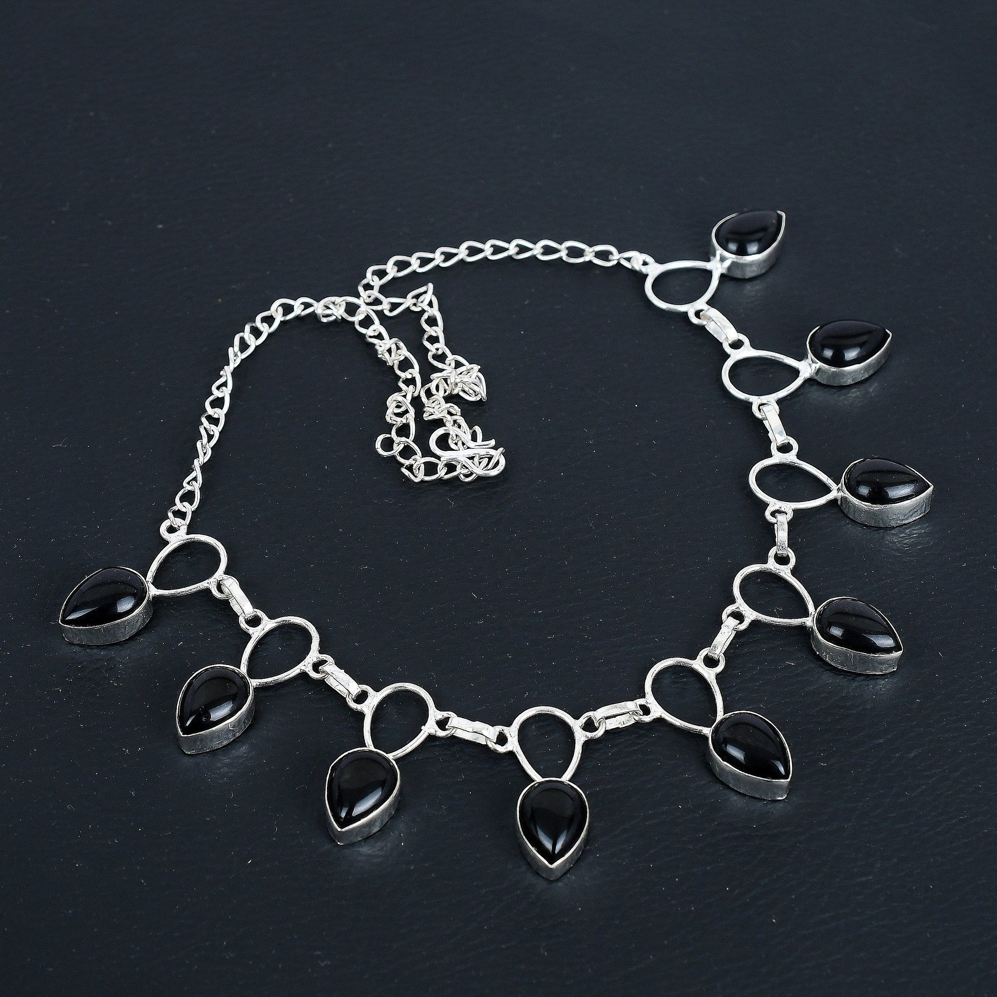 Design: This stunning piece features sleek teardrop-shaped black onyx stones set in a refined silver chain. The harmonious blend of the dark gemstones and the luminous silver creates a modern yet timeless aesthetic.